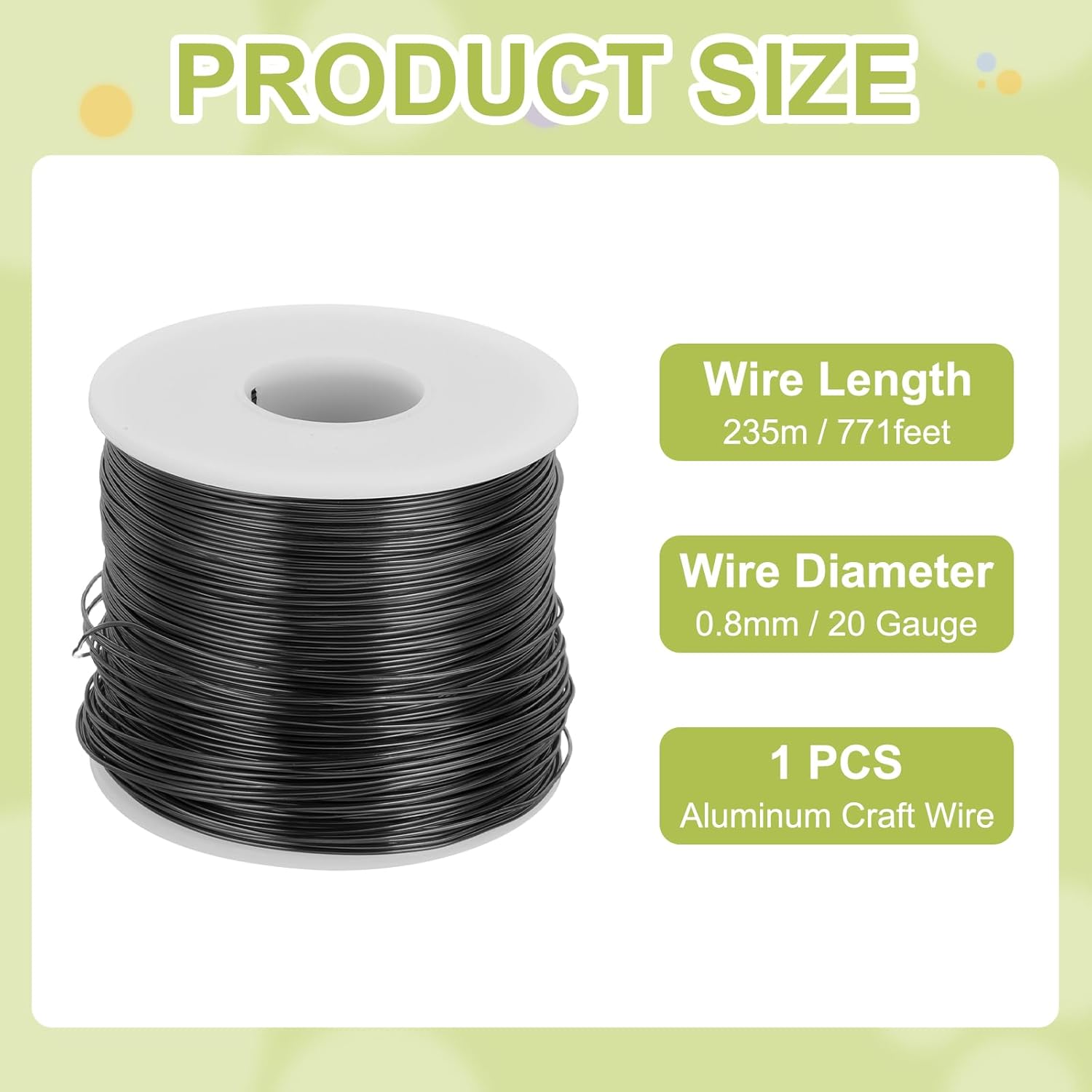 - Package contains 1pcs x Aluminum Craft Wire, wire diameter: 20 Gauge (0.8mm), wire length: 771 Feet (235m)
