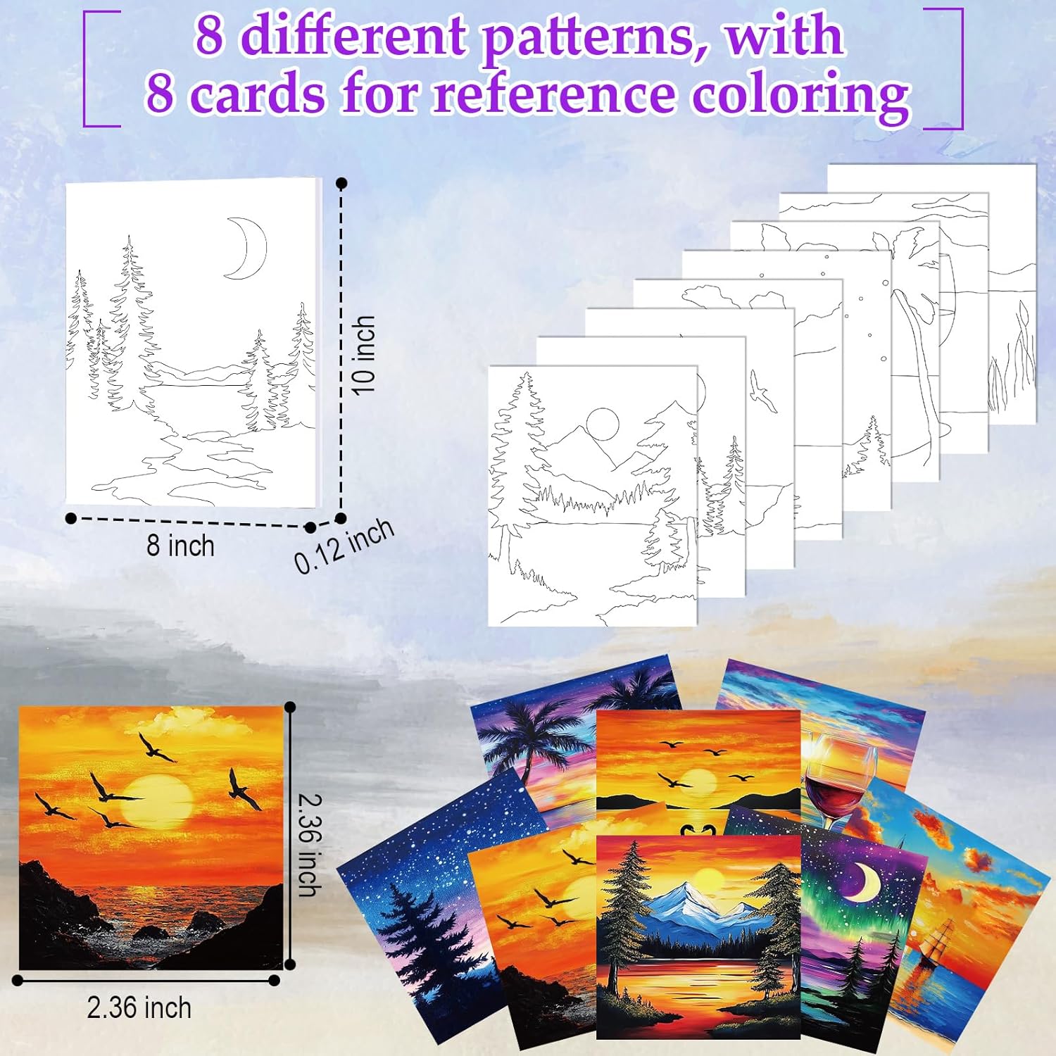 - Reference Matching Cards: you can doodle by following the reference cards provided, and you can explore different color schemes and hues; After the painting is finished, it can be given to friends as a gift, or these canvas paintings can instantly transform your room into an art gallery, can be displayed at home as an ornament