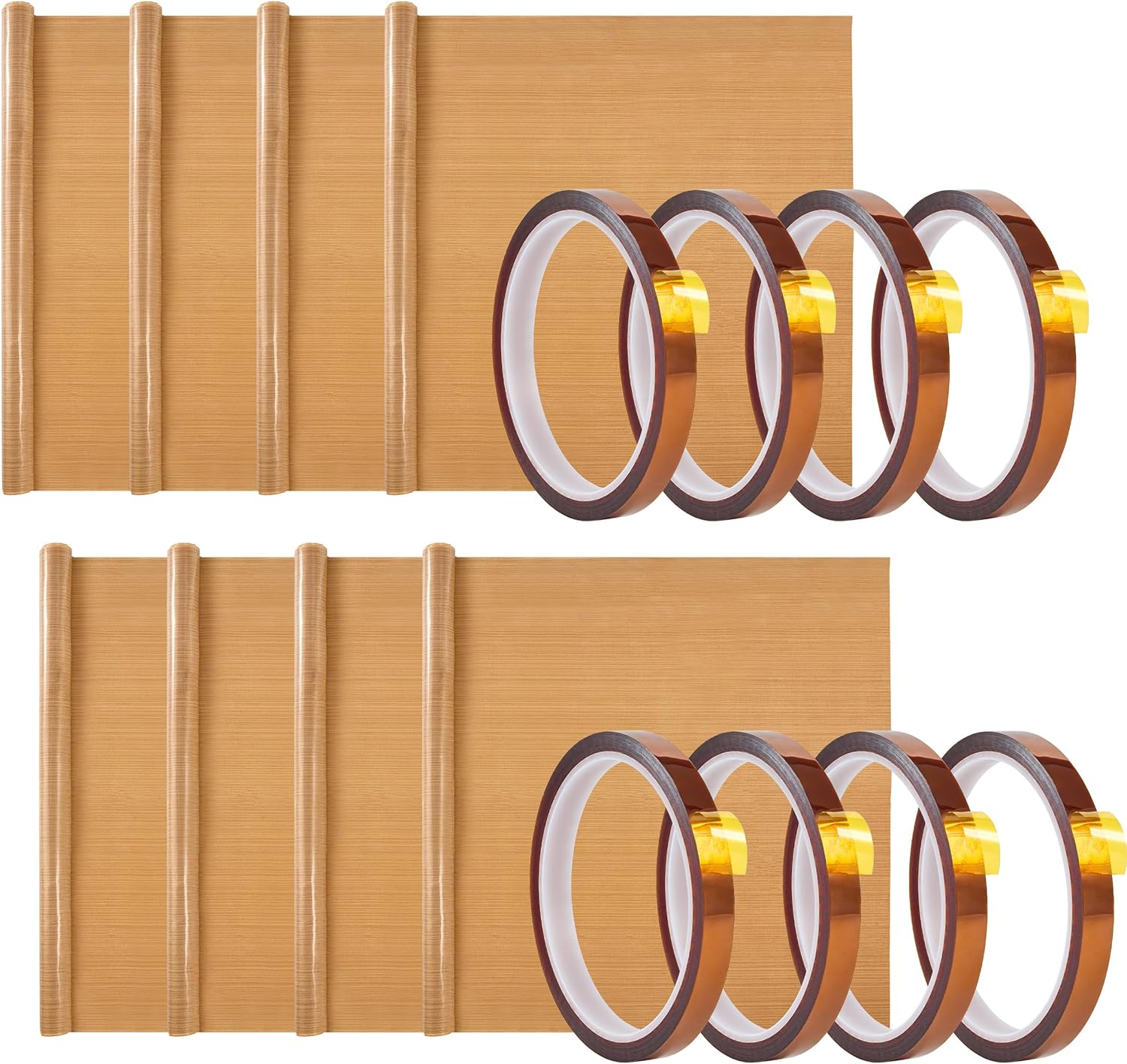 - Complete Set: Includes 8 pieces of Teflon paper and 8 rolls of heat transfer tape, perfect for heat press protective sheet applications and various DIY projects. Each heat transfer paper sheet measures 12" x 16" (30 x 40 cm) with a thickness of 0.12 mm. The tape measures 10 mm (2/5 inch) wide and 33 meters (108 feet) long.