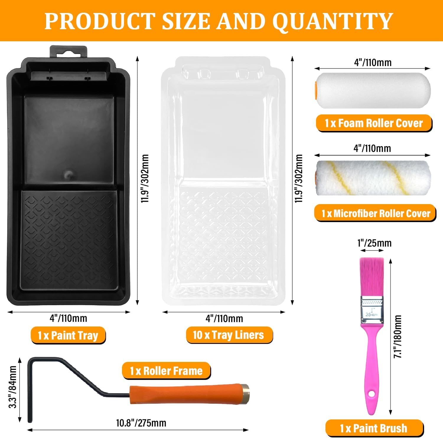4-inch Paint Roller Tray Set, 15-Pack Painting Tool Kit - 11 Paint Tray & Liners, Foam & Microfiber Paint Roller, Roller Frame, Paint Brush for Painting Wall, DIY Project