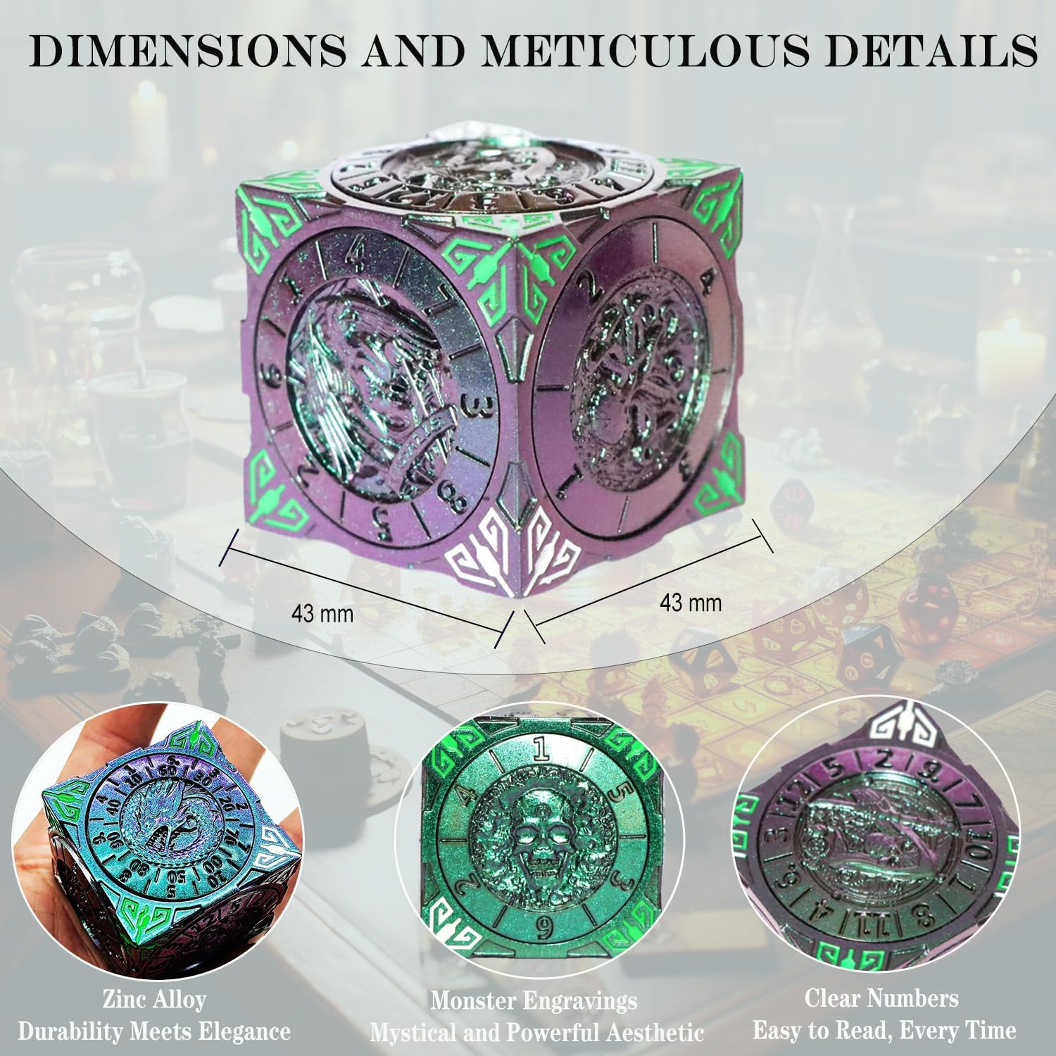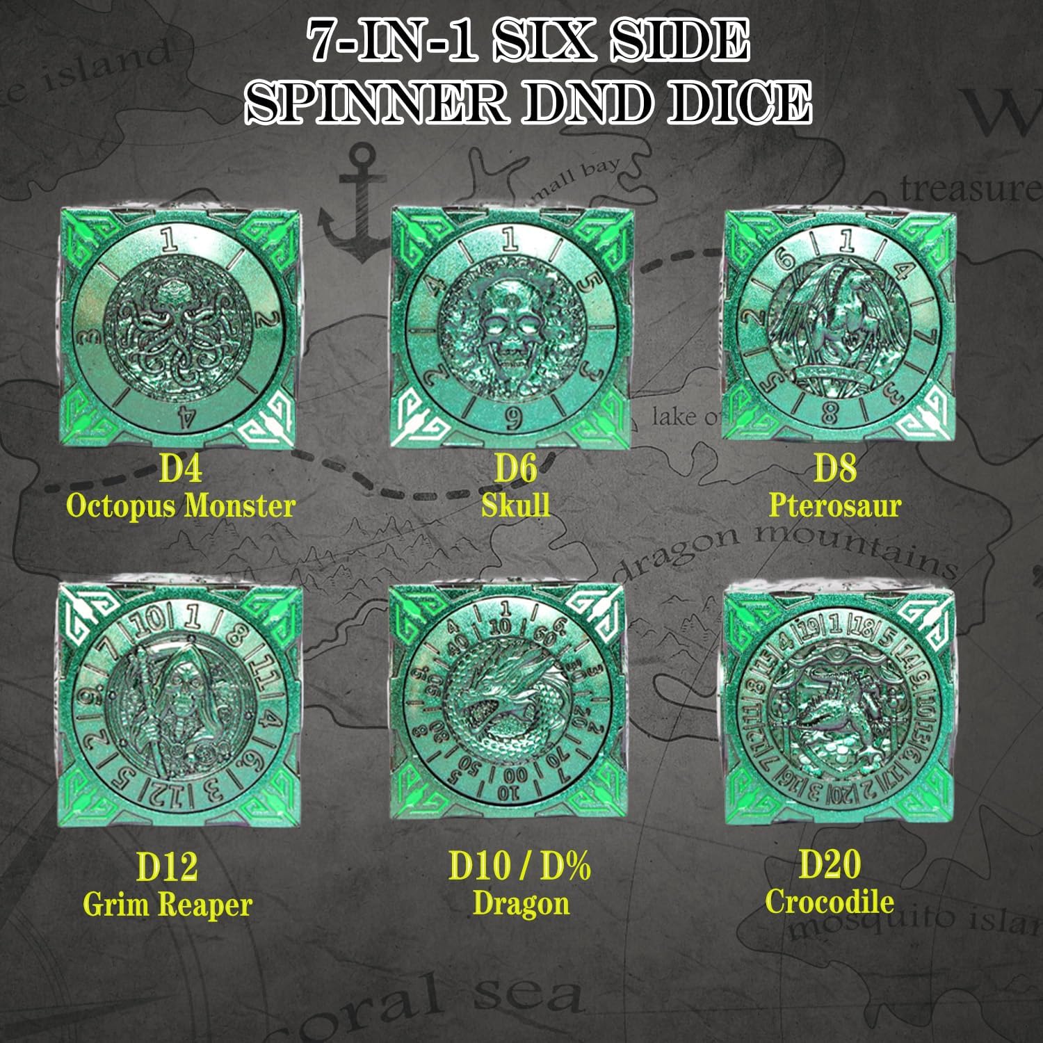 - All in One Multi-functional Design: This DND Dice integrates the functions of d4, d6, d8, d10, d10%, d12, and d20 into one die. Each face features exquisite engravings like octopus, skull, eagle, grim reaper, crocodile, and dinosaur, adding artistic flair and making it a standout piece on your gaming table.
