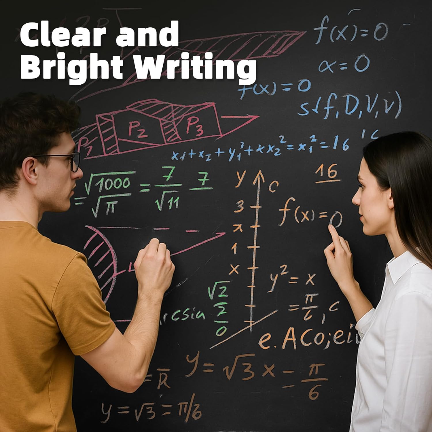 - Smooth Writing & Effortless Erasing: The chalk delivers strong adhesion and vibrant color saturation, producing uniform, deep-toned lines on blackboards without uneven fading. Its dust-free design minimizes airborne particlesโdry wiping requires only gentle friction, while wet wiping dissolves chalk residue completely.