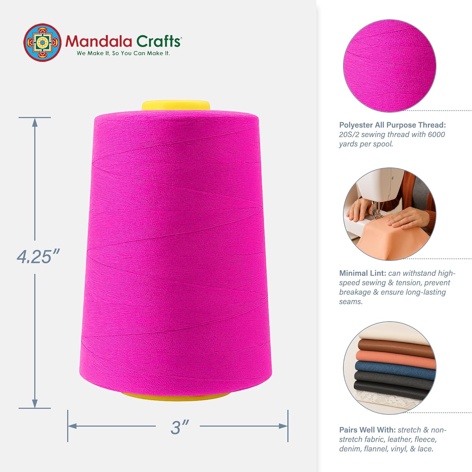 - Bulk Fuchsia Polyester Serger Spools Thread Sewing Supplies Kit: Each 4.25 x 3 x 3 in cone of thread is 6000 yards long. The 20wt all-purpose sewing thread serve as heavy duty cone serger thread for sewing machine for both residential and commercial use.