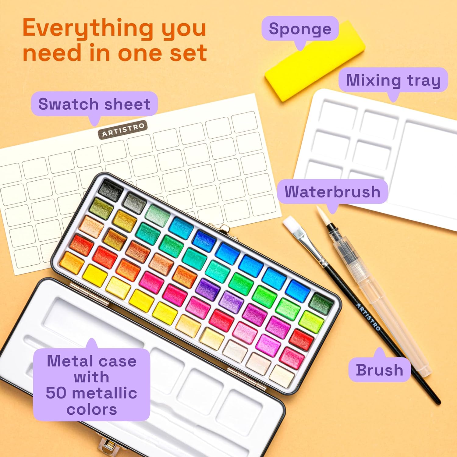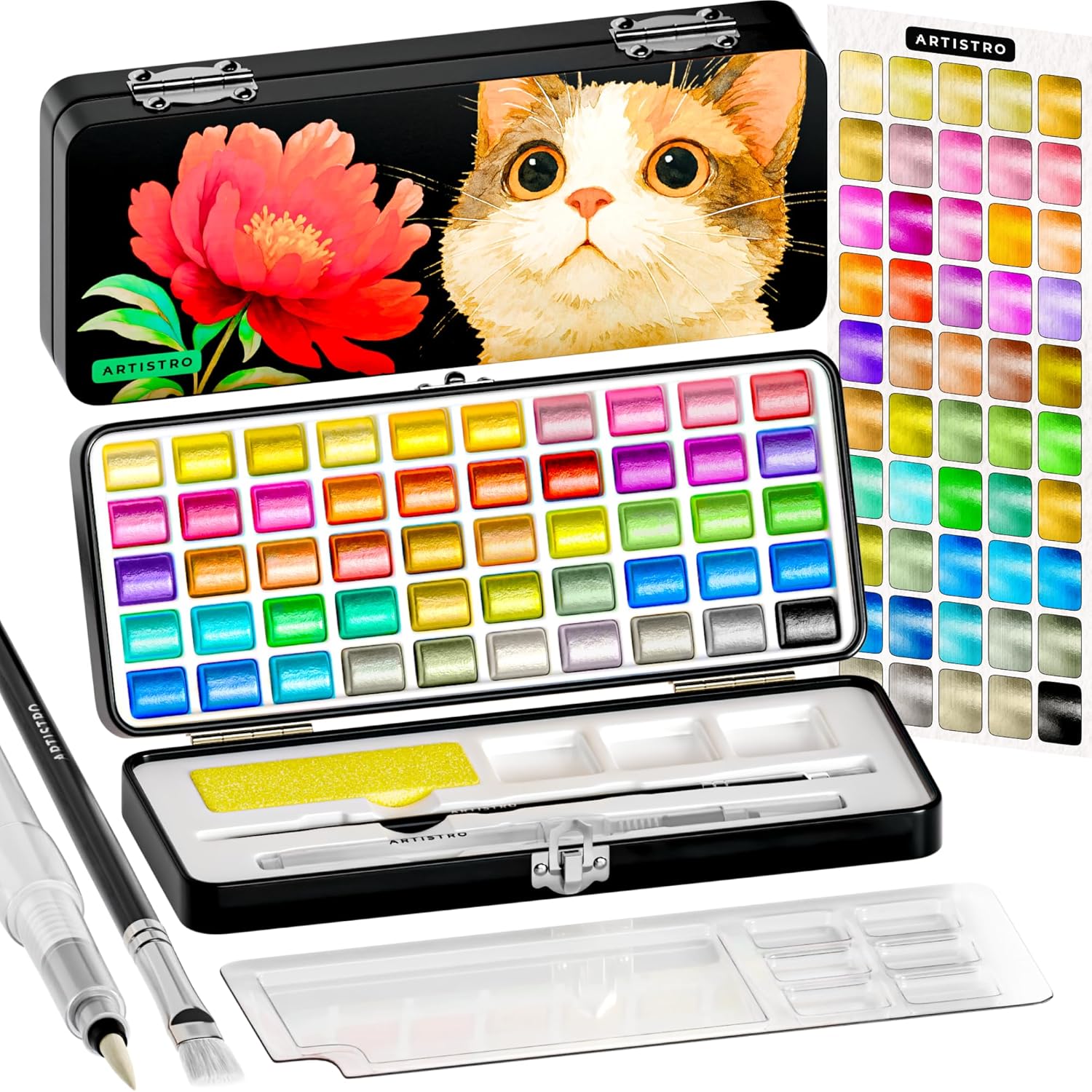 - 50 Shimmering Metallic Shades: Artistro metallic watercolor set includes 50 dazzling colors with a luminous, reflective finish. Perfect for highlights, decorative accents, lettering, calligraphy, and adding sparkle to any watercolor artwork.