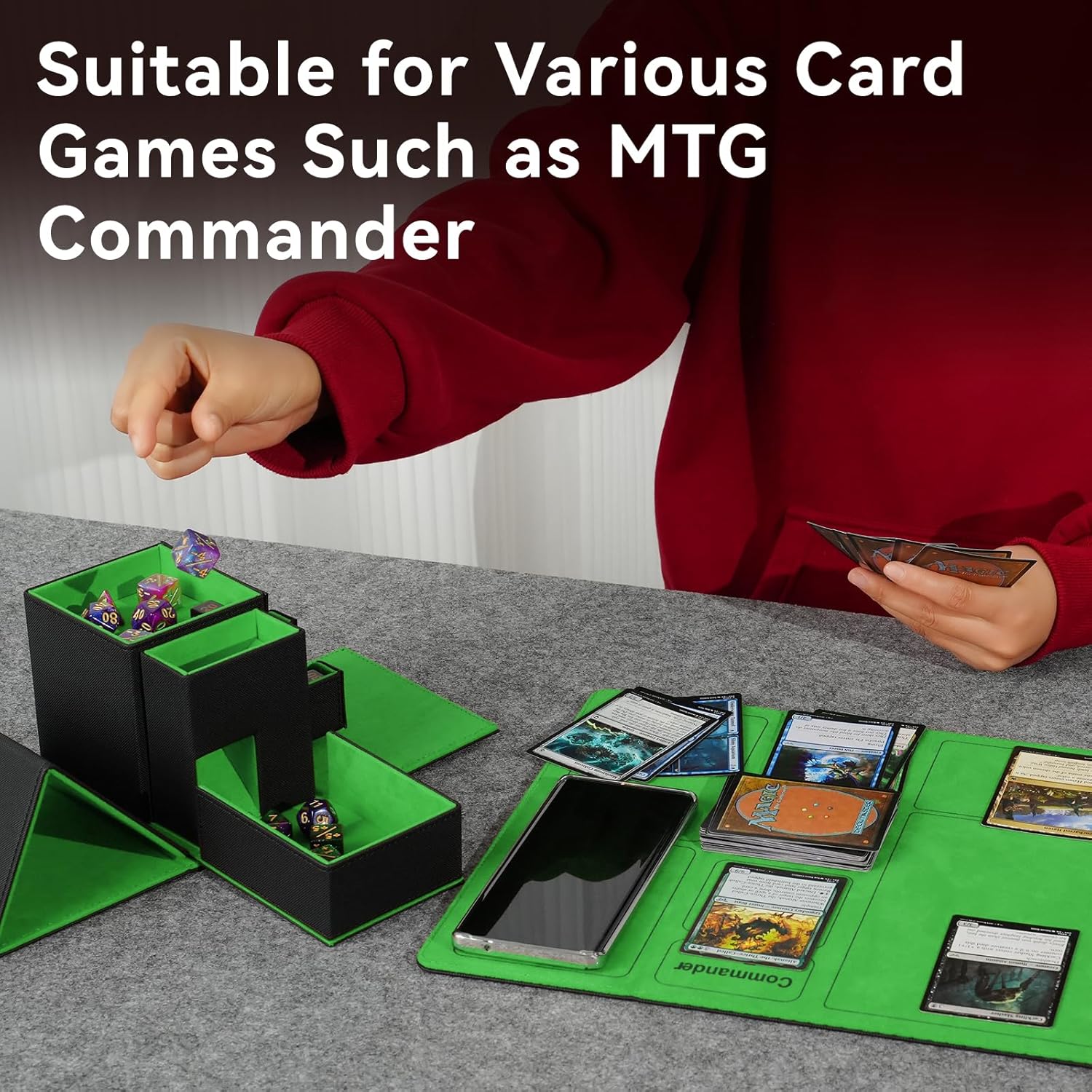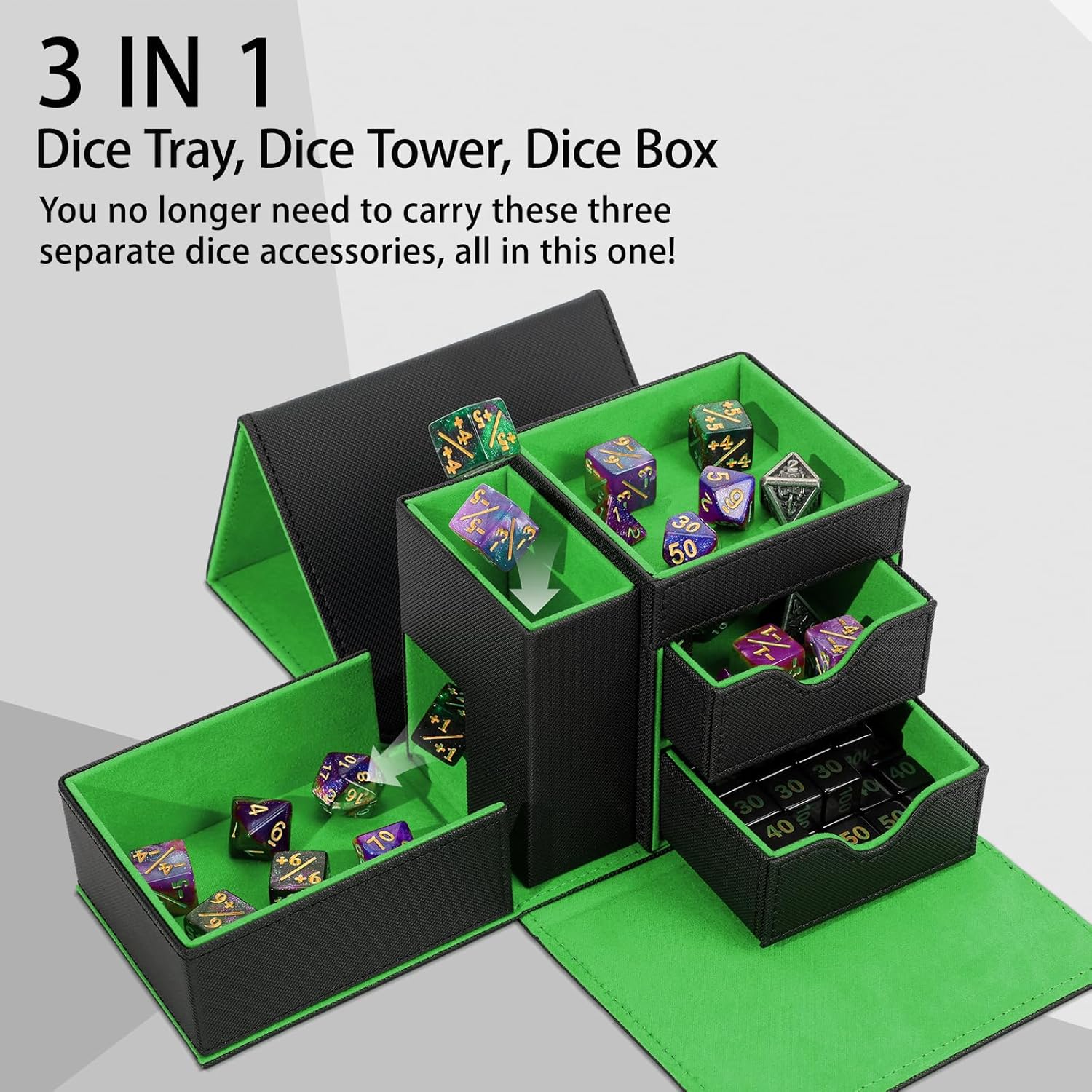 Dice Tower & Tray Storage Box, 3 in 1 Dice Holder Case (Rolling Tower Dice Storage Drawers, Rolling Tray), Leather Magnetic Closure DND Accessories Gifts for RPG MTG, Black/Green