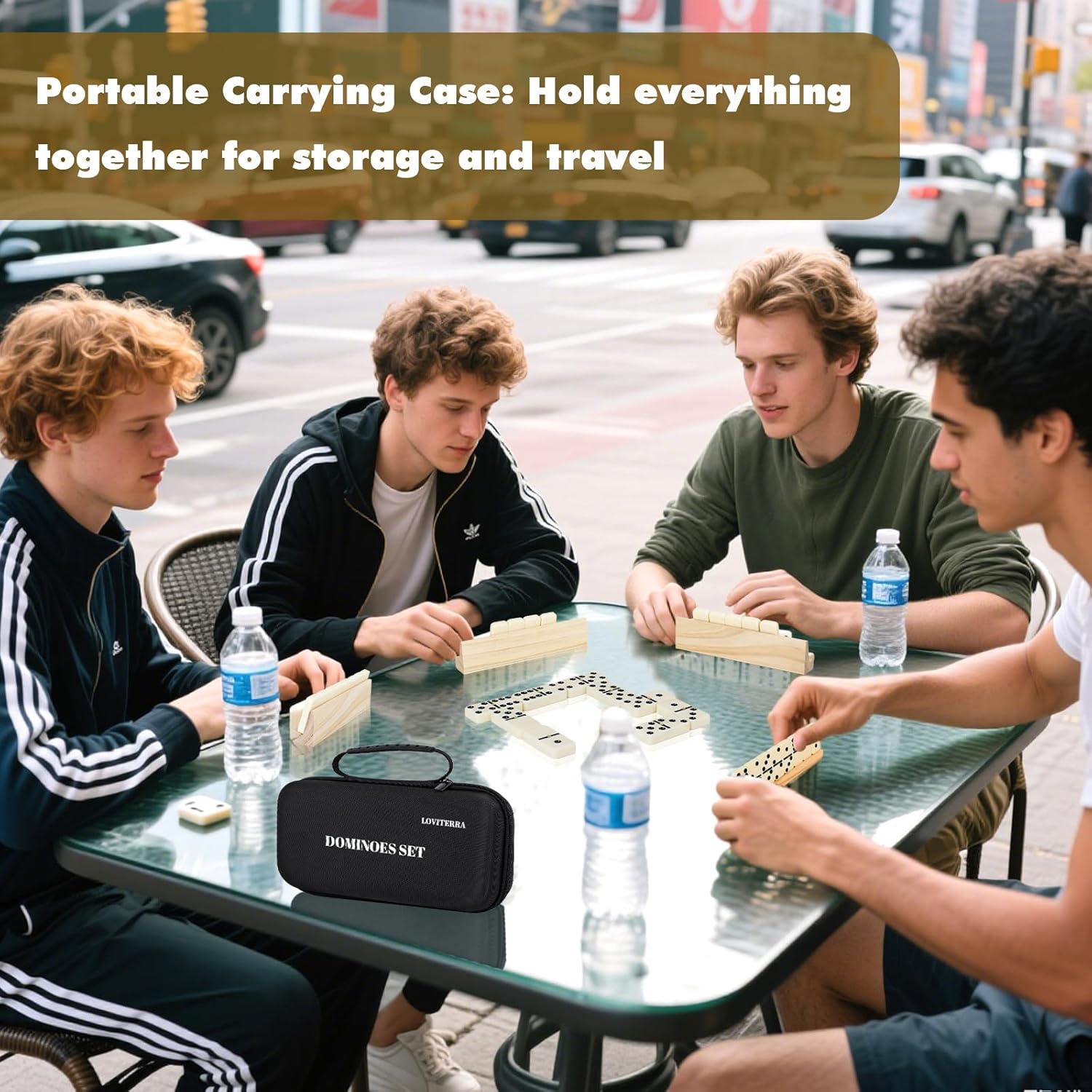- Premium Domino Set: The domino set includes 28 durable tiles with a plastic box, 4 wooden racks, instructions and a convenient carrying case, making it ideal for family game nights, travel, or casual play.