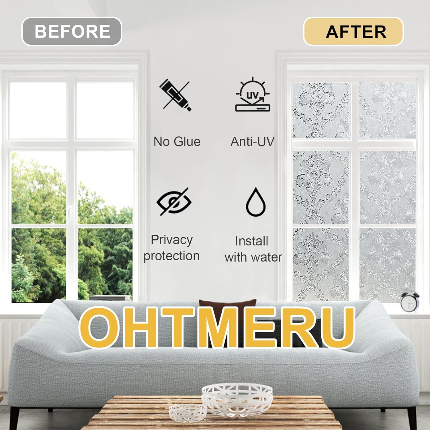 - Artistic Design - OHTMERU Window Privacy Film brings the beauty into your living space. Its graceful and luminous design casts soft, natural light, creating a serene and sophisticated atmosphere. Perfectly versatile, it adds elegance and charm to any window.