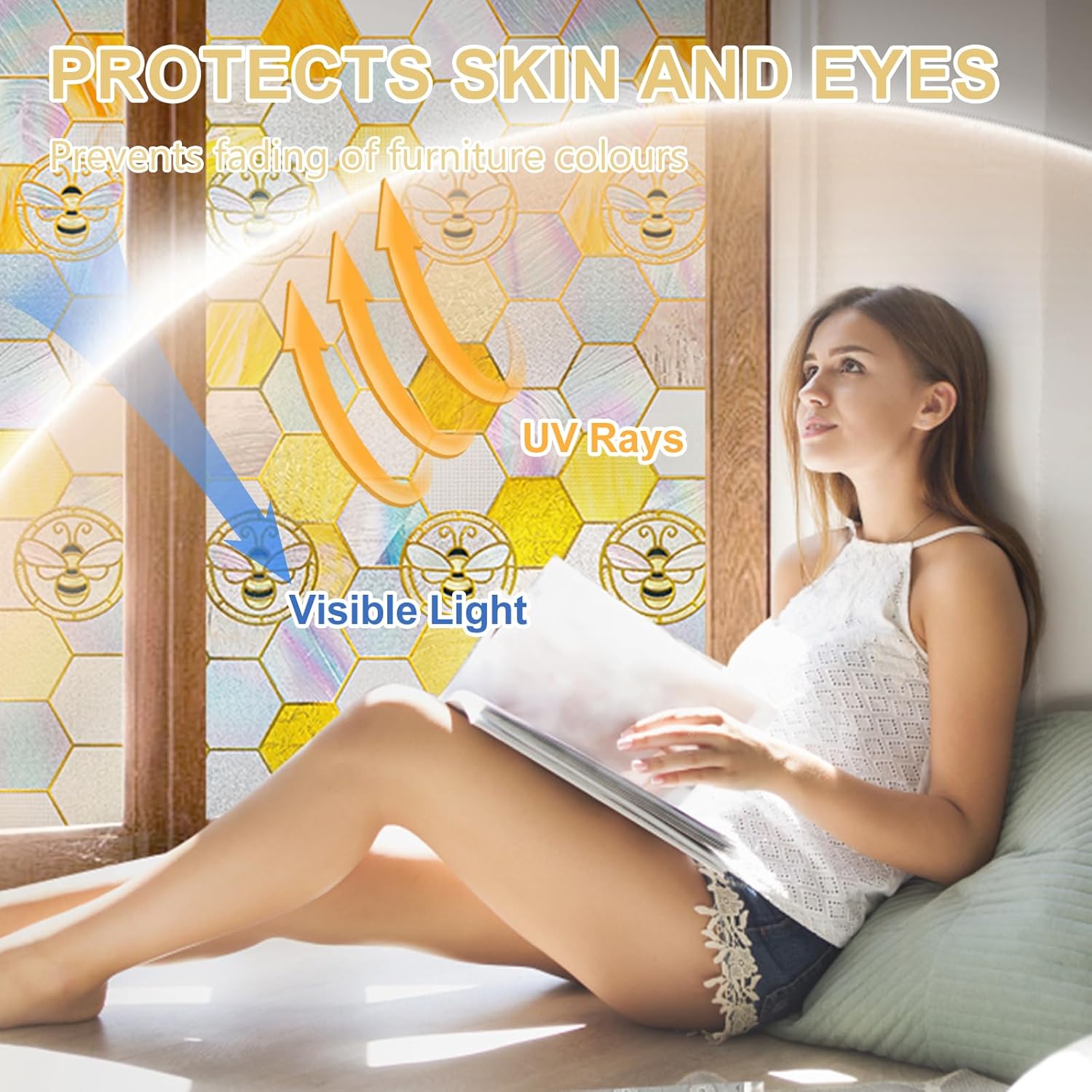 - Honey Comb Art-The Honey Comb OHTMERU Stained Glass Window Privacy Film features vibrant yellow, white, pink, blue, and purple hexagons with bee motifs and golden accents. Its 3D effect mimics real stained glass and enhances the colour of your living space.