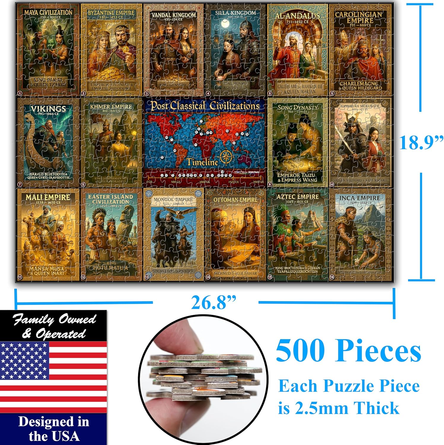 - 【A JOURNEY THROUGH HISTORY】 - Travel back in time and explore the world's most fascinating post-classical civilizations. This beautifully illustrated 500-piece puzzle showcases 16 unique empires, from the Mayan Civilization to the Ottoman Empire, offering a captivating glimpse into our global past. Collection of Stunning Posters of Medieval Civilizations including: Byzantine, Vandal, Silla, Al-Andalus, Vikings, Khmer, Song, Kamakura, Mali, Easter Island, Mongol, Aztec, Inca and more.