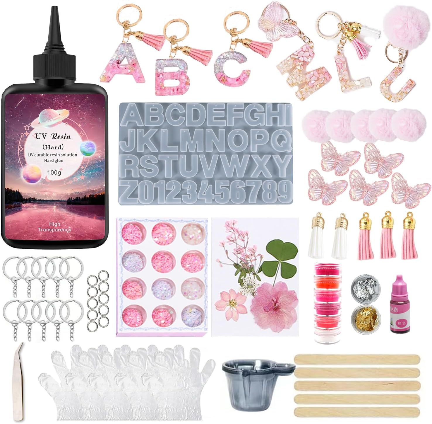 - ❤【UV Resin Jewelry Making Kit】:This UV Resin Jewelry Kit includes 100g crystal clear resin, 26 letters and digital molds, 5pcs fluffy ball, 5pcs tassel, 5pcs butterfly pendant, 12pcs sequins, 1pcs dried flower, 6pcs glitter powder, necklace chains, keychains, rings, tweezer, disposable gloves, gold/silver foil, pink toner, tape disposable cups and stir stick.(Please refer to the picture)