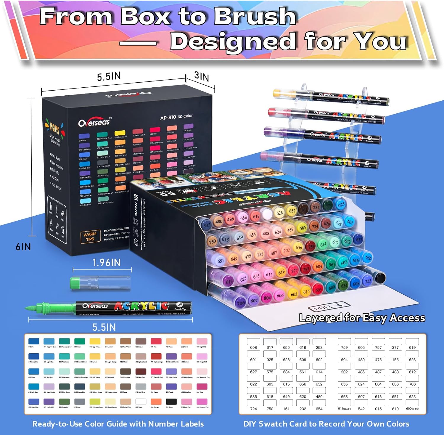 - Bright and Vibrant Colors: This set of acrylic markers contains 60 colors. Featuring a color chart on the box and corresponding color codes on the caps, you can easily find your desired color. The convenient layered pull-out design further ensures easy access to all markers