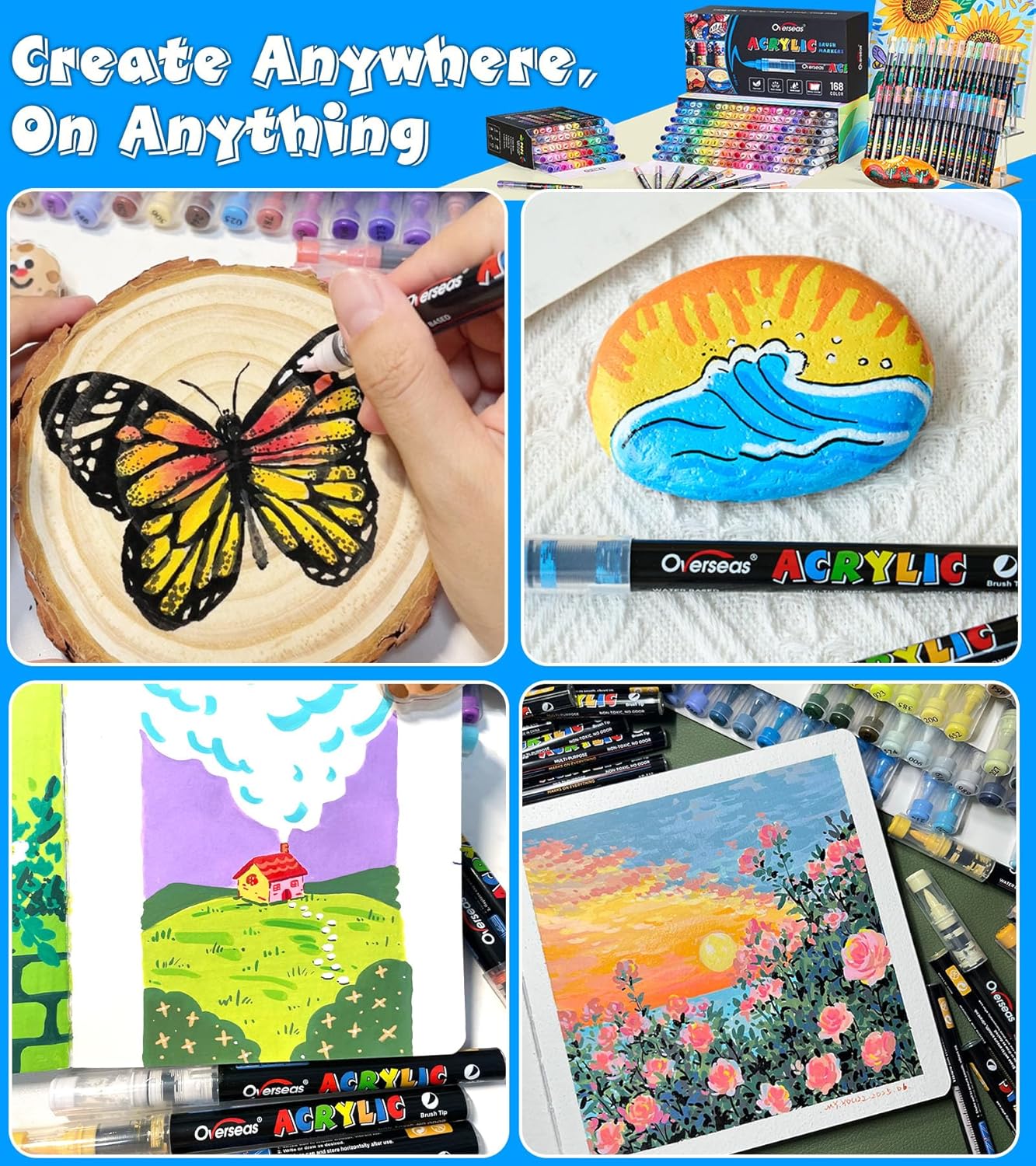 Overseas Acrylic Paint Markers 60 Colors, Brush Tip Paint Pens with Automatic Ink Control System, Quick Drying Liquid Ink Acrylic Marker for Rock, Wood, Canvas, Glass, Fabric, Metal, Plastic, Rubber