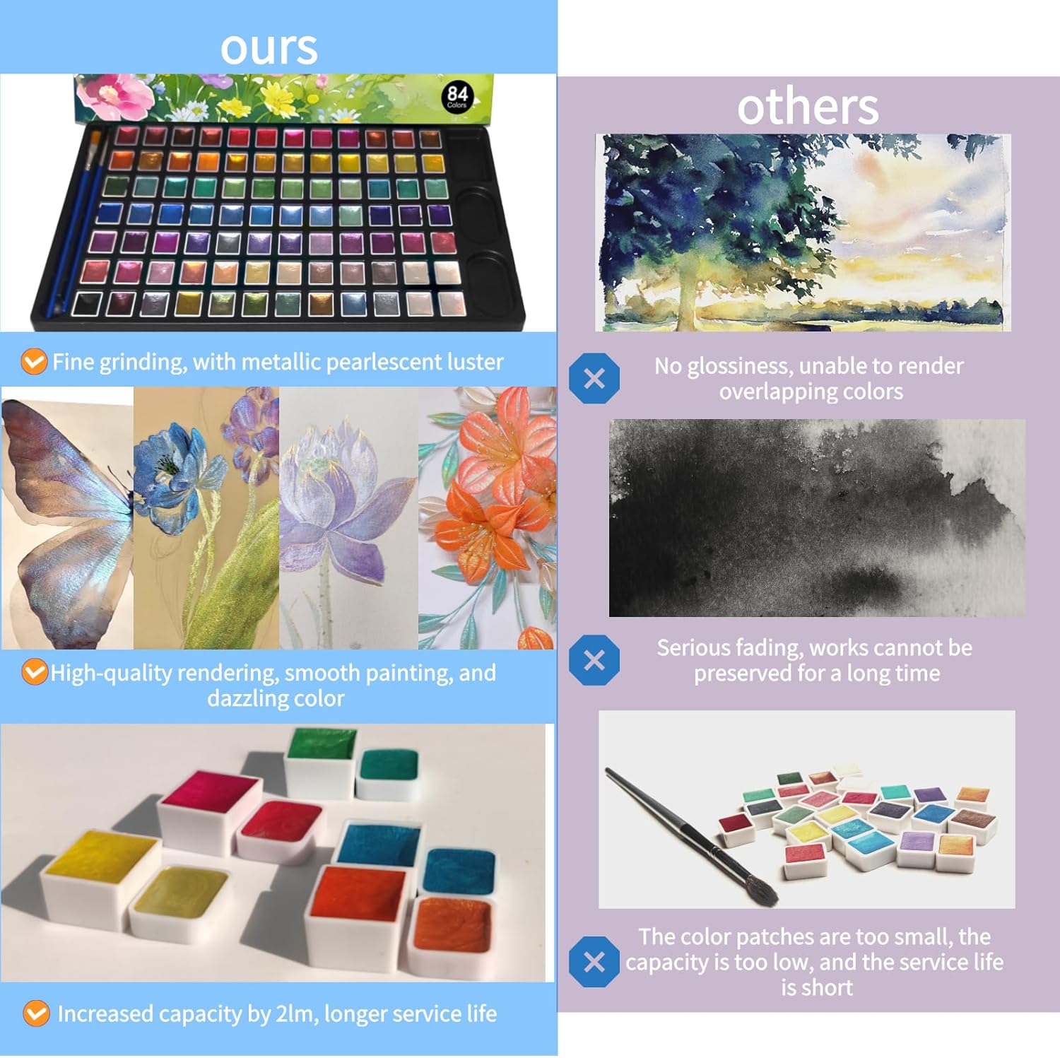 - MULTIPLE COLORS TO CHOOSE: The product is divided into 36/60/84 checkered color blocks. 36 and 60 colors are beginner style with 2 brushes and 1 watercolor brush, suitable for art beginner students. 84 colors are advanced style with more colors and 2 brushes, suitable for art lovers who already have experience. Please select the corresponding style according to your needs