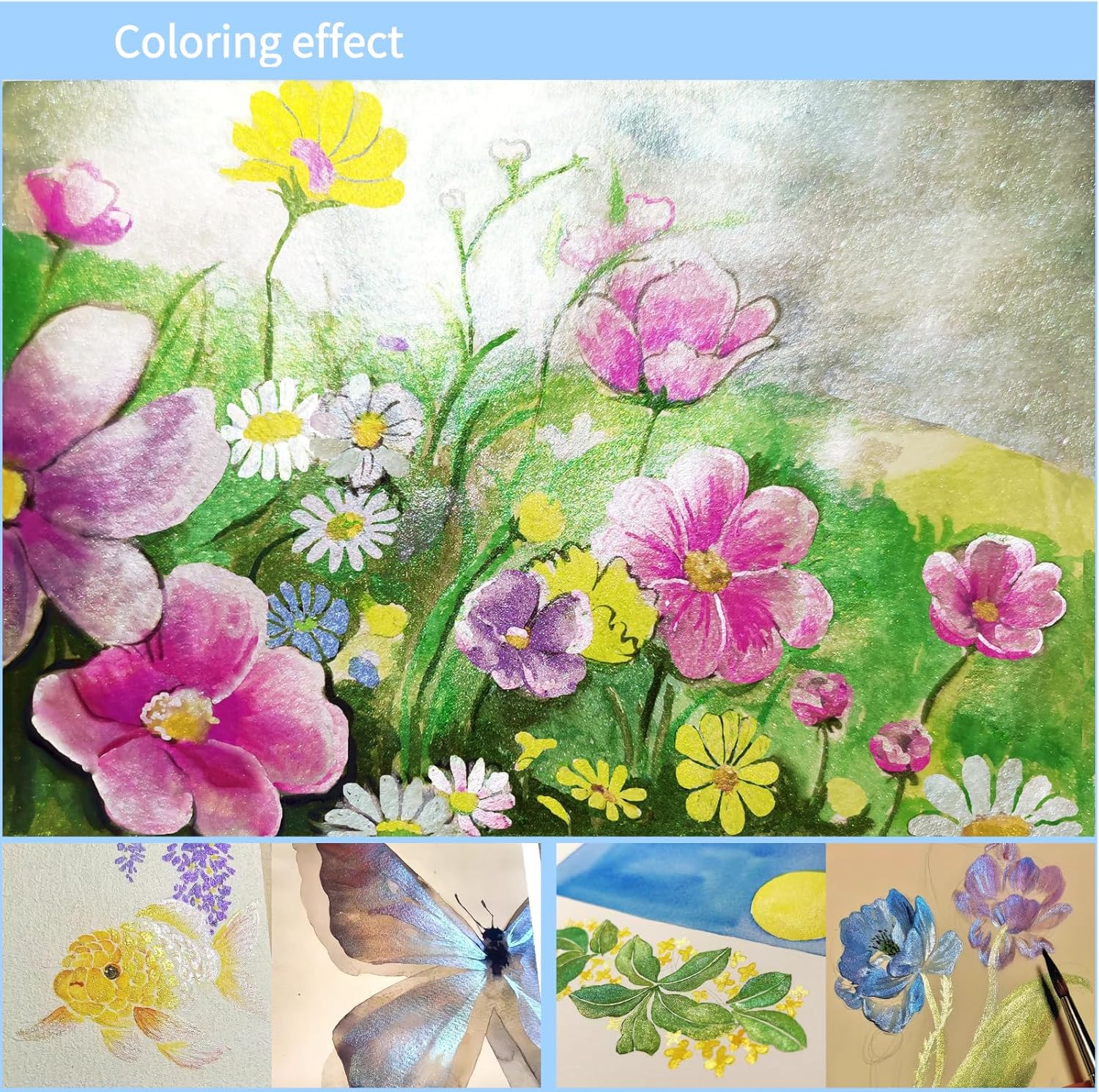 - Pearl luster effect: Because the pigment contains modified mica powder, it produces a shiny pearl luster effect when painting, which makes your works glittering. It can also be used as a base for paintings and as a secondary color on finished works, and can be used in combination with other pigments to create unlimited possibilities