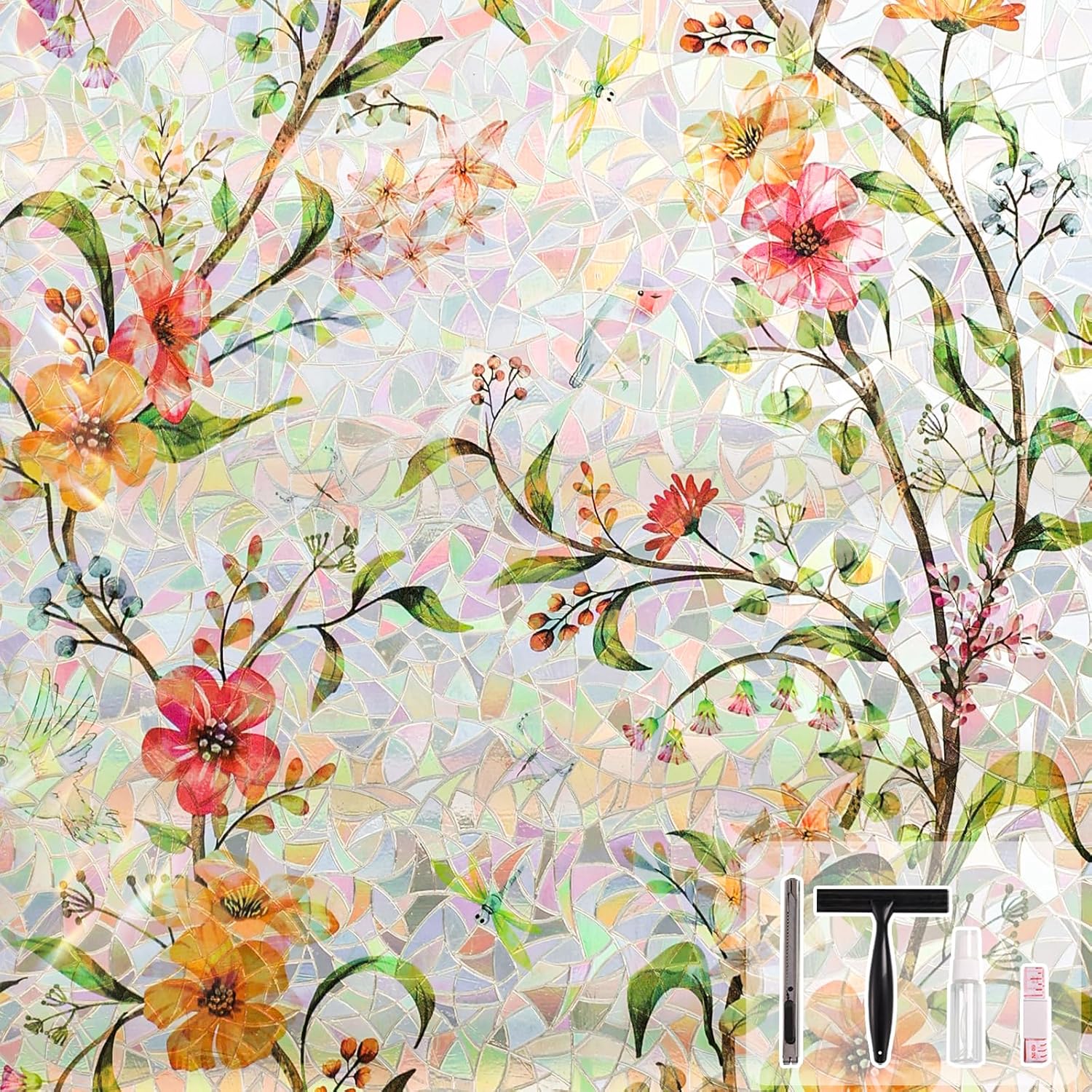 NINETREX Window Privacy Film,Stained Glass Window Film,Rainbow Decorative Stickers Static Cling Anti UV Heat Control for Home Decor (Galsang Flower,17.5 x 157.4inch)
