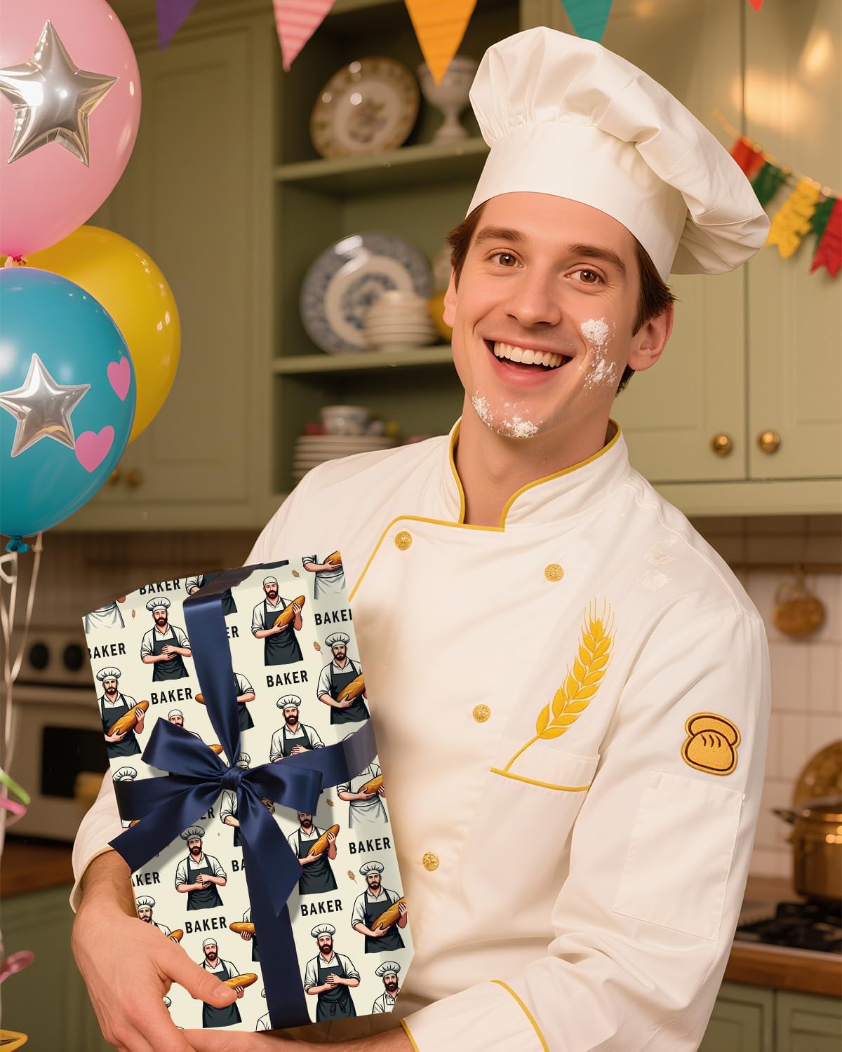 - ADORABLE BAKER DESIGN: Our wrapping paper is beautifully printed with a charming assortment of baking-themed elements, including: cheerful bakers, essential baking tools, tempting croissants, loaves of bread, and powerful mixers. It also features playful "Baker" lettering that adds a special touch.