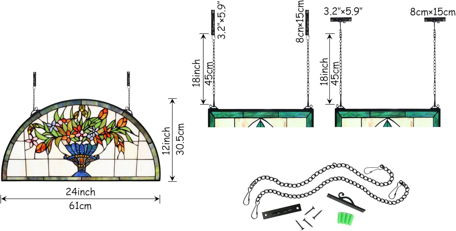 - 【Size & Material】: The half round stained glass panels measure 24"×12"×0.2"(W×H×TH), Net Weight :13.9 lbs. It includes 2 sets rust-resistant hooks and chains, for easy wall mounting. This stain glass window hanging is 100% genuine stained glass with a handcrafted copper frame, framework with patina treatment prevents oxidation