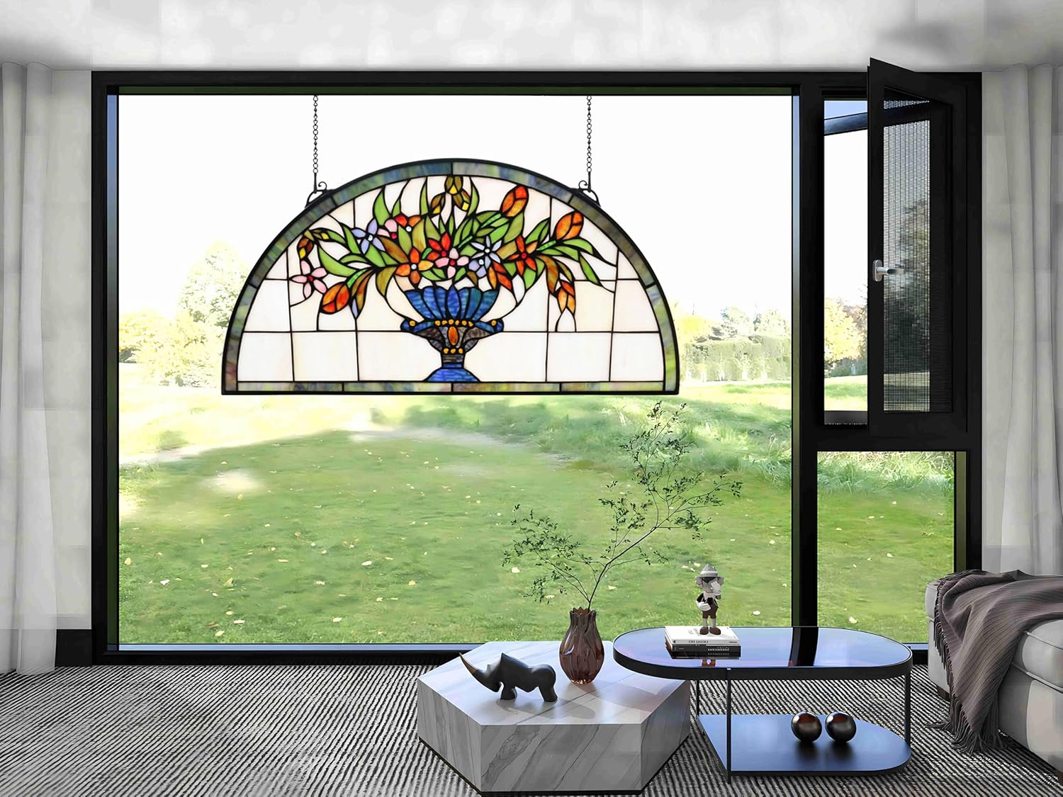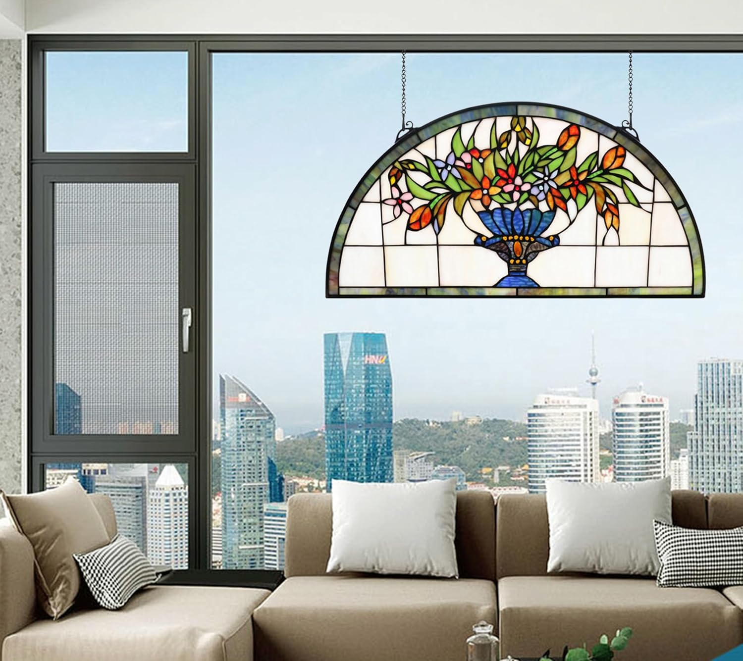 24 inch Flower Stained Glass Window Hanging Half Moon Shade,100% Real Stained Glass Panelfor Home Decor(YLK005)