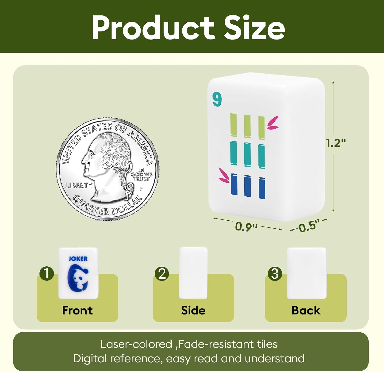 - American Mahjong Tile Set: The mahjong game sets include 166 tiles (36 Dots, 36 Bamboos, 36 Characters, 12 Dragons, 16 Winds, 16 Flowers, 10 Jokers and 4 Blank Spares mah jong tiles), Each white color tile measures 1.2 x 0.9 x 0.5". It is compatible with the vast majority of mahjong rack(This set don't include mahjong rack)