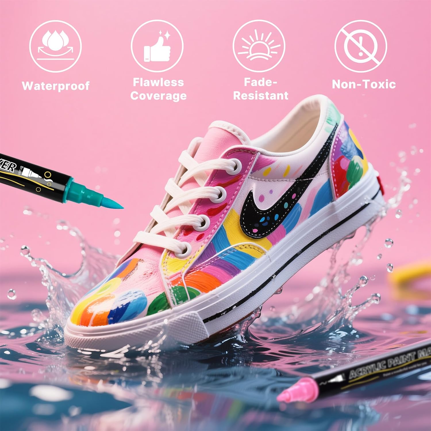 - 🌿【Non-Toxic Certified: Multi-Surface Compatibility】Certified non-toxic and low-odor, these water-based acrylic pens are safe for artists across all age groups. Use these adaptable paint markers on canvas, ceramic, fabric, wood, and other common surfaces without primer.