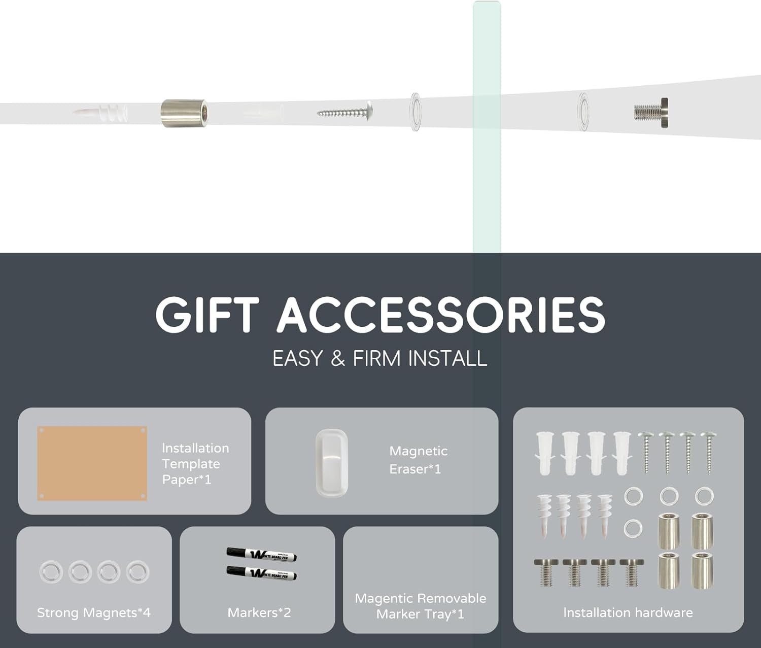 - Enhanced Functionality: Our magnetic glass whiteboard comes with 4 strong magnets, 2 markers, 2 magnetic eraser, and a magnetic removable aluminum marker tray, offering everything you need for an efficient and organized workspace. The powerful magnets ensure your documents stay securely posted.