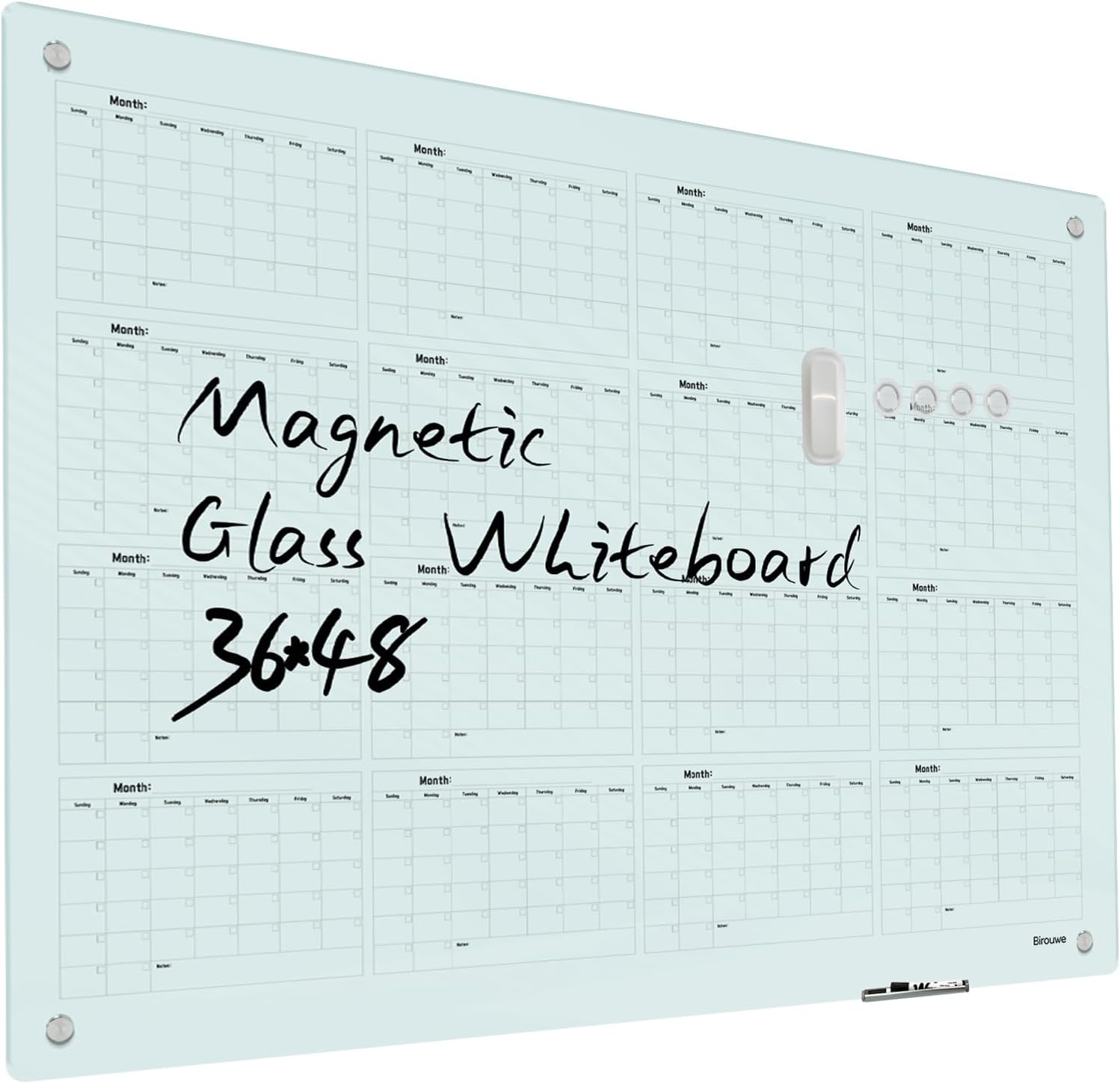 Magnetic Glass Yearly Calendar Whiteboard - Glass Dry Erase Board 48"x36" Large Frameless Glass Board for Walls Office School and Home
