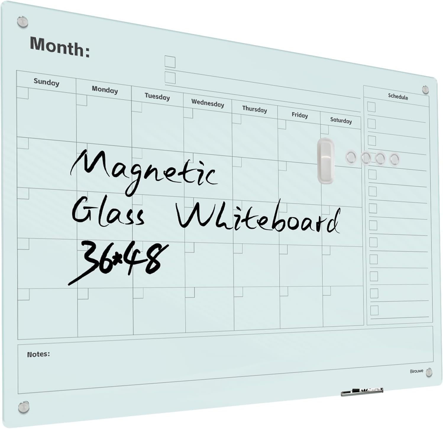 Magnetic Glass Whiteboard - Glass Monthly Calendar Dry Erase Board 48"x36" Large Frameless Glass Board for Walls Office School and Home