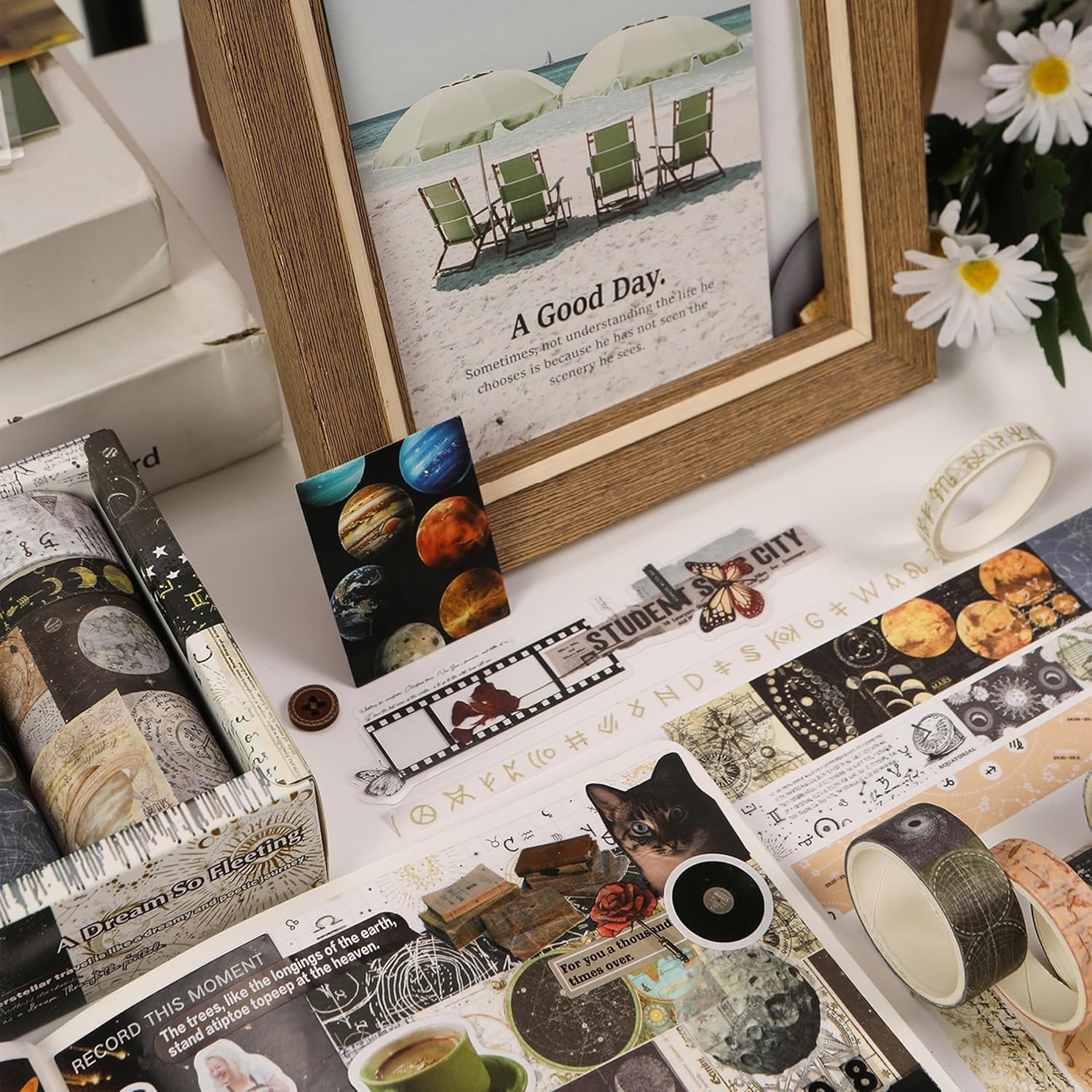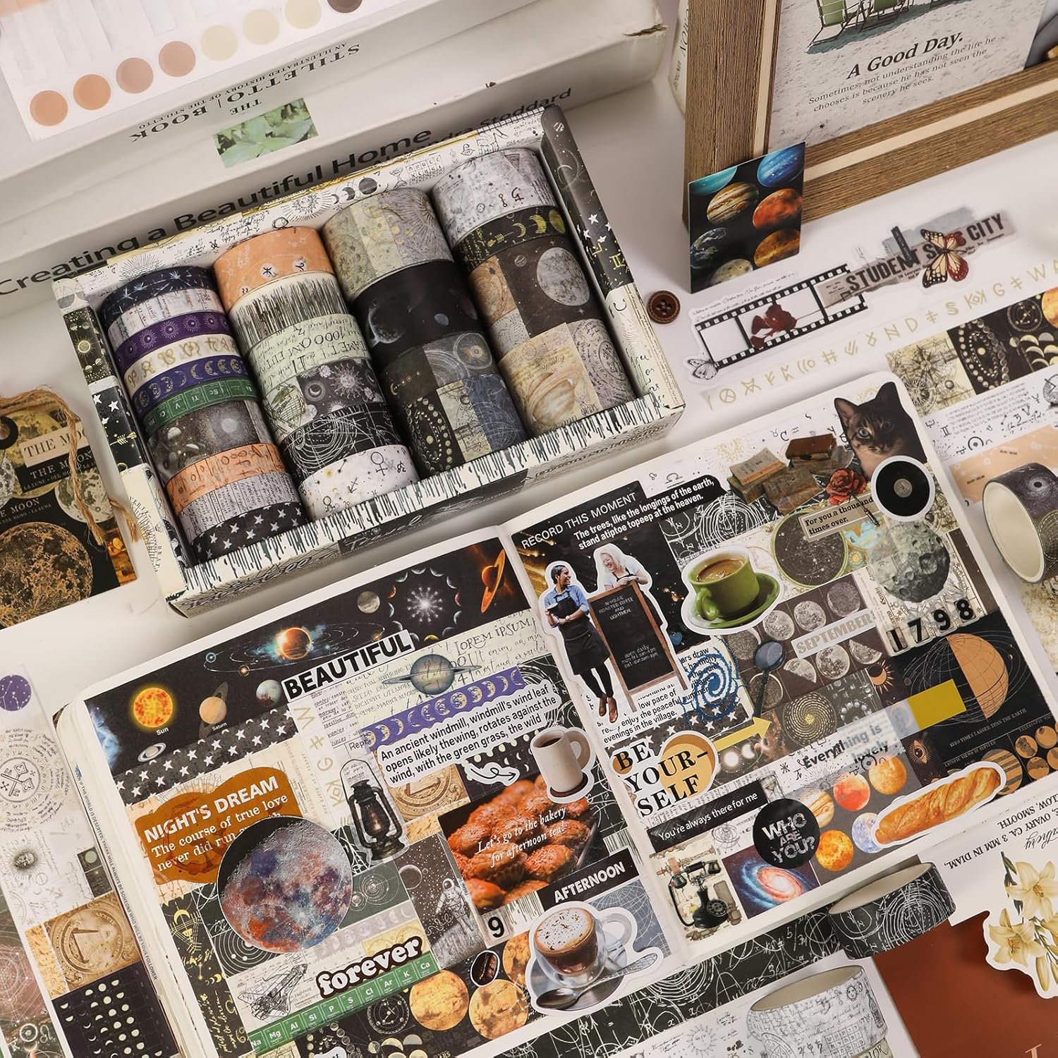 - 👍【CLASSIC AESTHETIC DESIGN】Immerse your projects in nostalgia with 24 unique washi tape rolls, each featuring a different retro-inspired pattern. From antique floral prints and old postcards to vintage maps and faded manuscripts, every roll adds a touch of timeless charm to your crafts