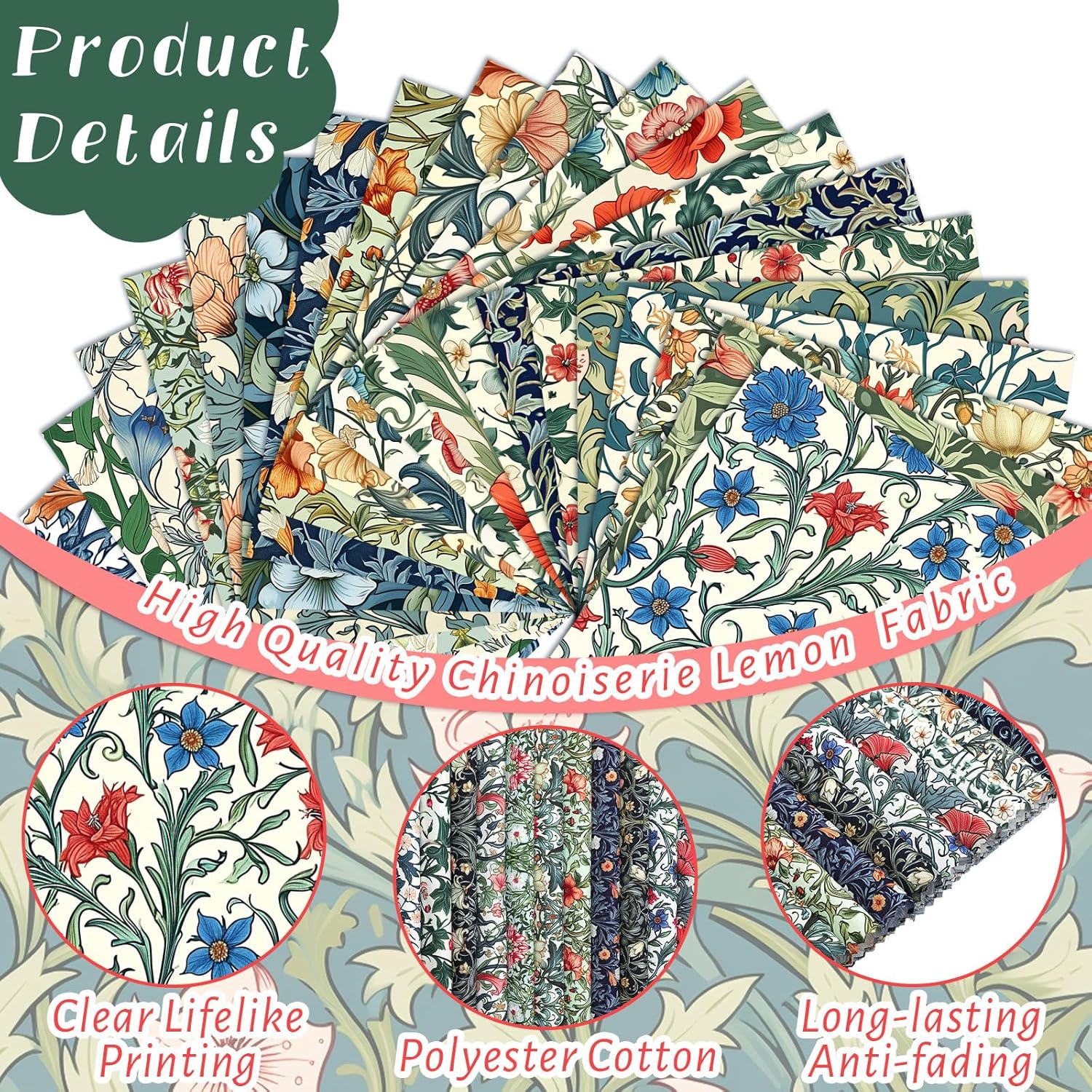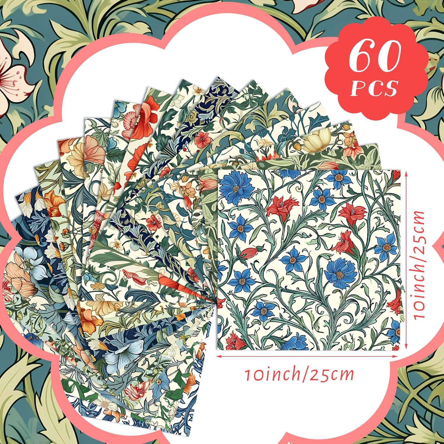 - Vibrant and Diverse Quilting Fabrics: presented in a package of 60 pieces, these magnificent william morris floral fabrics offer an array of patterns to choose from, such as American flag and eagle; Our quilting fabric measures around 10 x 10 inches/ 25.4 x 25.4 cm, providing ample space for your most creative projects