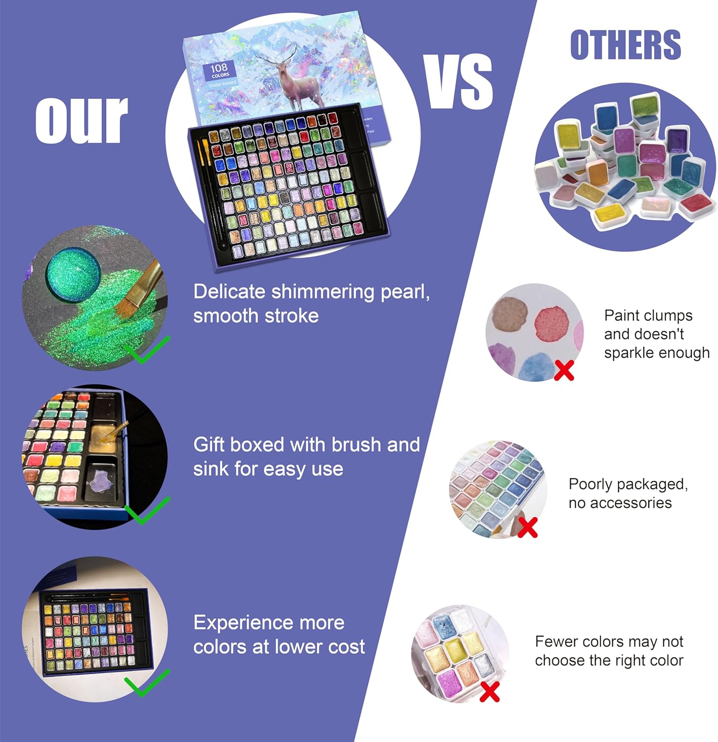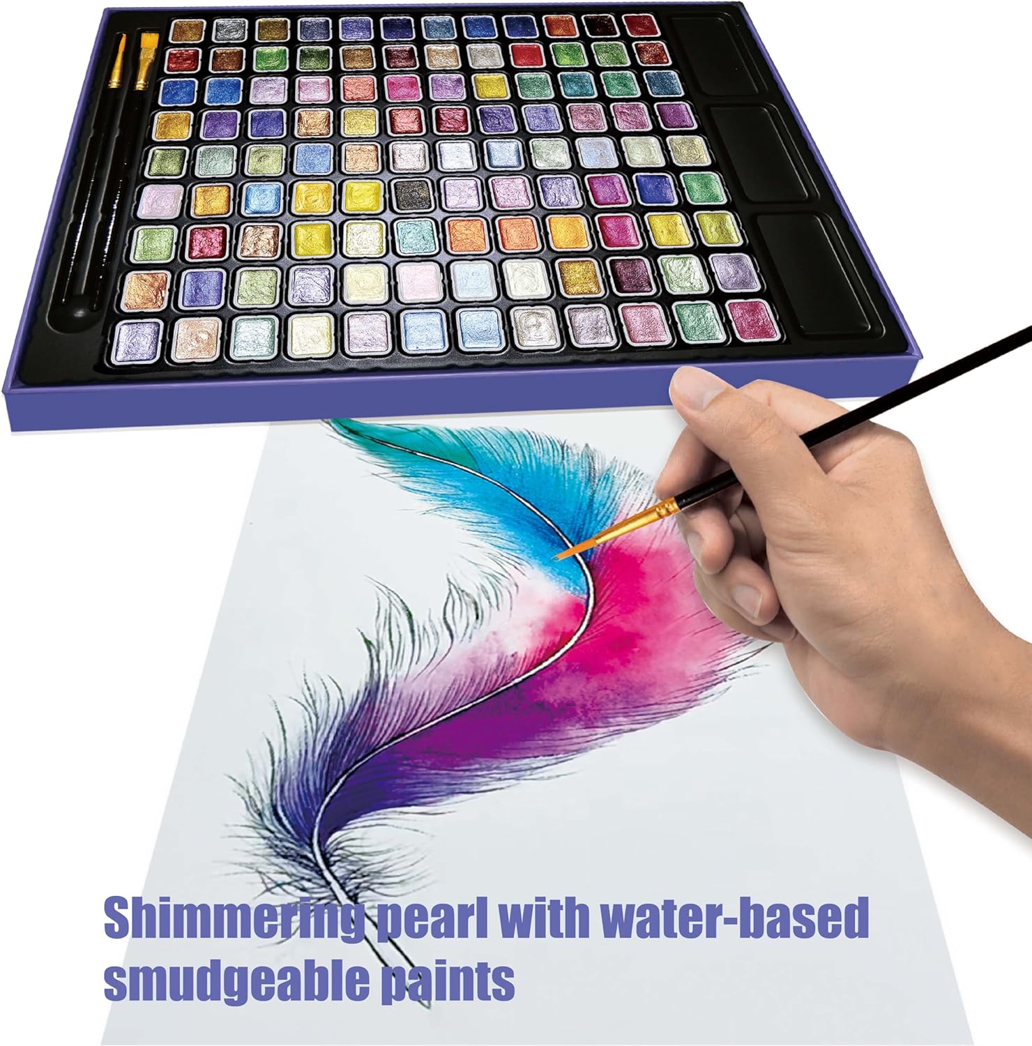 - Paint Set CPearl Watercolor Paint Set - The GlisDyck professional watercolor kit features 60/108 vibrant colors with intense shimmer mineral pigments, Includes 2 brushes and 3 sinks. Metallic watercolor blend effortlessly, offering glitter effect on light/dark surfaces,Ideal for watercolor sets for adults &kids, the smooth formula dries quickly without clumping or flakingontents: 108 unique pearlescent watercolor solid paint colors in convenient 1ml mini size