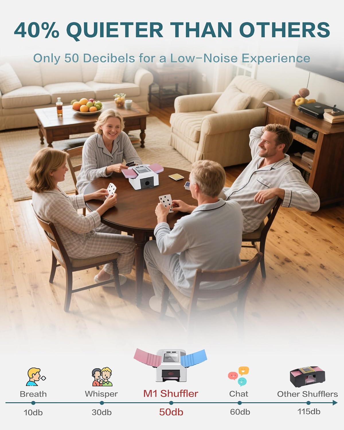 - đ ăLOW NOISE SHUFFLINGăEngineered to operate 40% quieter than standard shufflers, the ONTILT M1 Card Shuffler keeps noise levels around 50 decibels. Whether youâre playing high-stakes Poker or a relaxed round of UNO, enjoy your game without the distraction of loud mechanical noise.