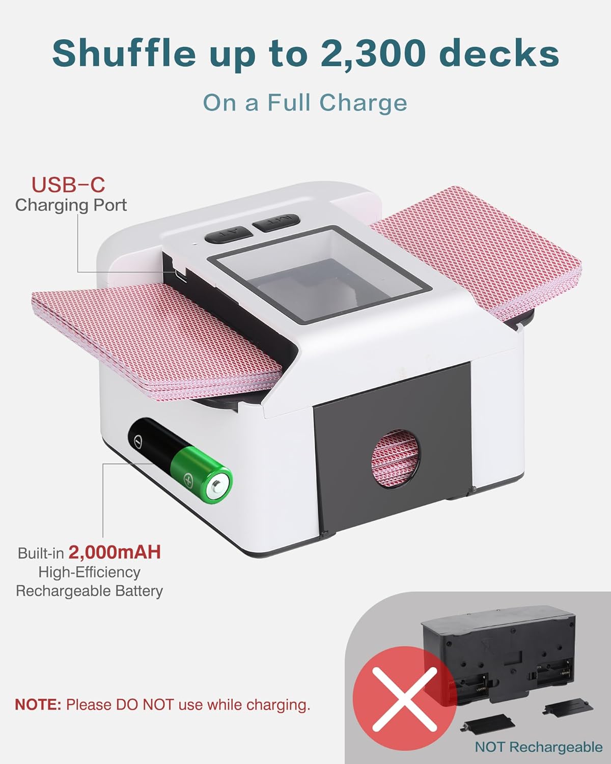 - đ ăRECHARGEABLE & PORTABLEăWith a built-in 2000mAh rechargeable battery, the ONTILT M1 Shuffler can shuffle up to 2,300 decks on a single charge. Its compact, lightweight design and USB-C port make it easy to carry and recharge wherever you areâno need for disposable batteries.