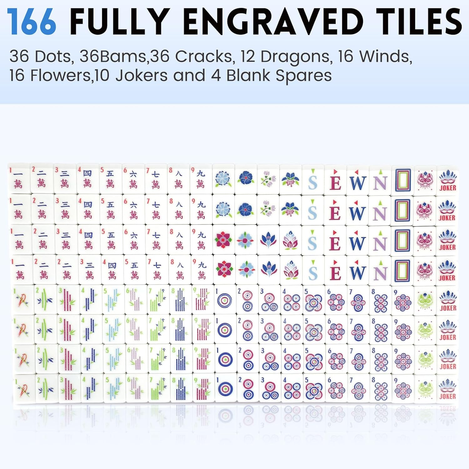 - 【Mahjong Tile Design】 Set Includes 166 Tiles (36 Circles, 36 Bamboos, 36 Characters, 12 Dragons, 16 Winds, 10 Jokers, and 4 Blank Spares,8 Flowers And 8 Seasons) With Chinese Characters Engraved Clearly.