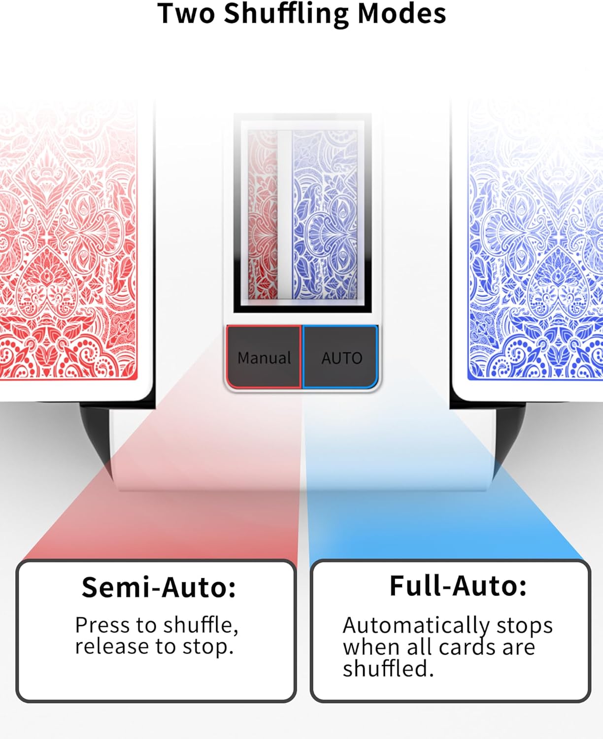 - 【Full-Auto & Semi-Auto Shuffle Modes】 In Full-Auto mode, a single press shuffles all cards and stops automatically. For precise control, Semi-Auto mode lets you hold to shuffle and release to stop.
