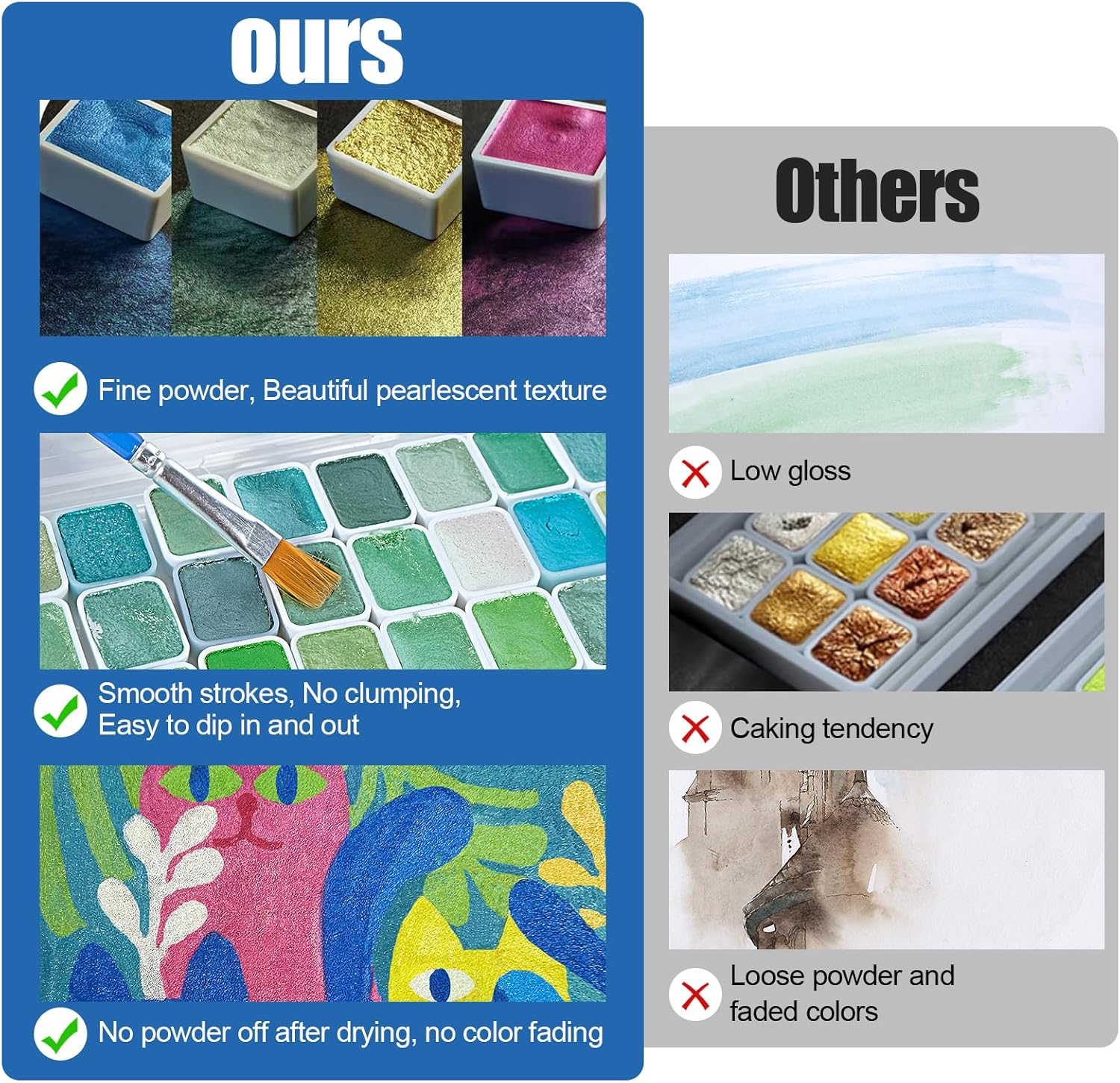 - 【Smooth Strokes, No Powder Off】Our watercolors paint set are extremely durability. Glitter watercolor remain highly stable, drying without crumbling or fading, making the watercolor painting shine forever. The fine powder texture makes the strokes of the pearl paint smooth and resists clumping