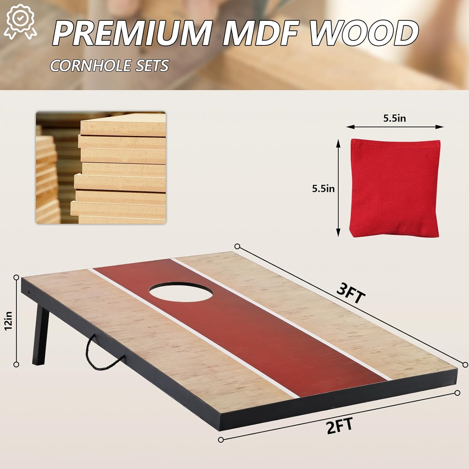 - CLASSIC CORNHOLE GAME SET:This complete cornhole set includes 2 foldable engineered wood cornhole boards (4’x2’), 8 all-weather regulation size cornhole bean bags (4 red + 4 blue). Perfect backyard and outdoor game for family and friends.