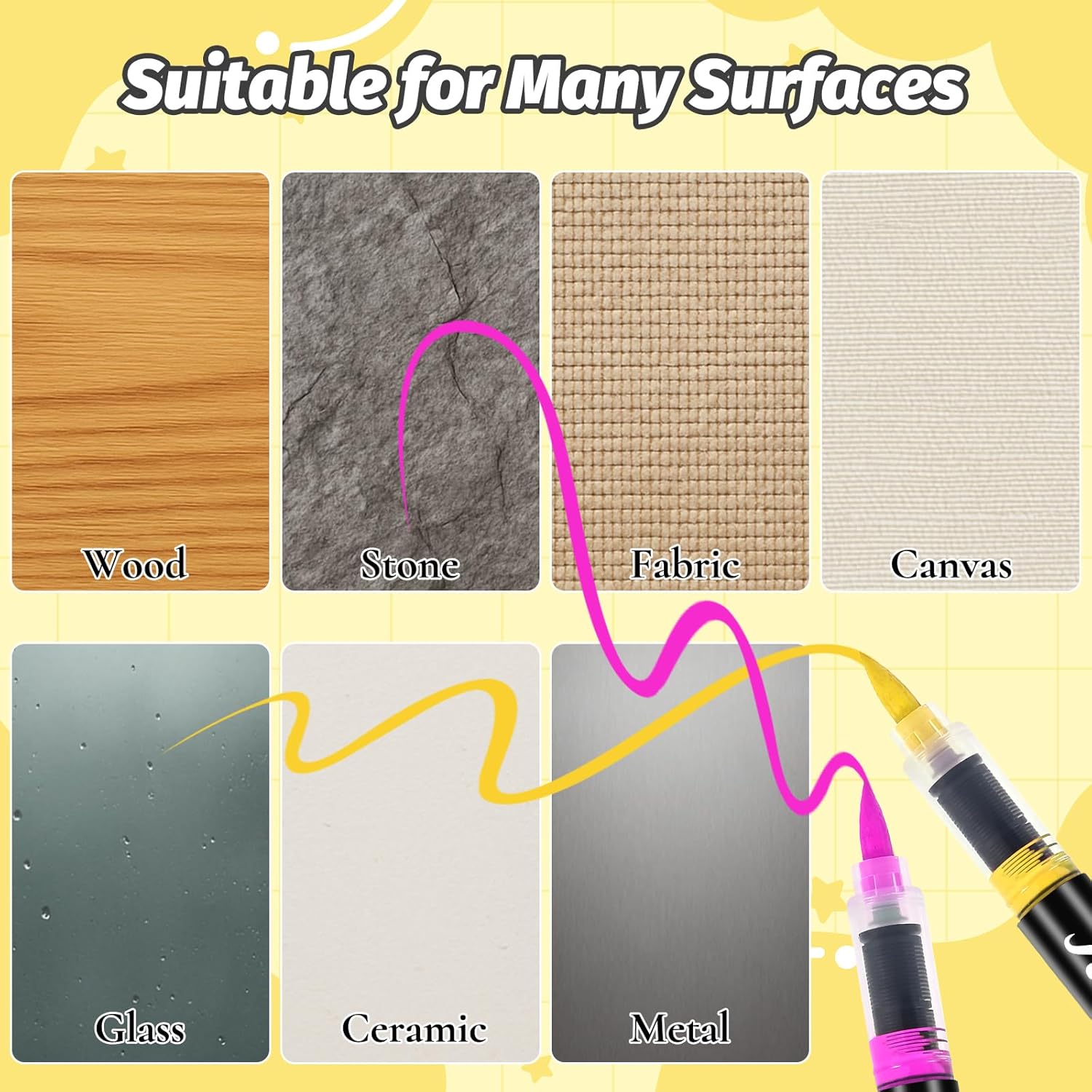 - Flexible 1–5mm Brush Tip for All Strokes Equipped with a flexible soft tip, these acrylic markers seamlessly transition between thin 1mm lines and wide 5mm strokes. Whether you're outlining intricate details or filling large areas, the brush-style tip mimics real paintbrush strokes—ideal for lettering, blending, or layering on textured surfaces like wood and stone.