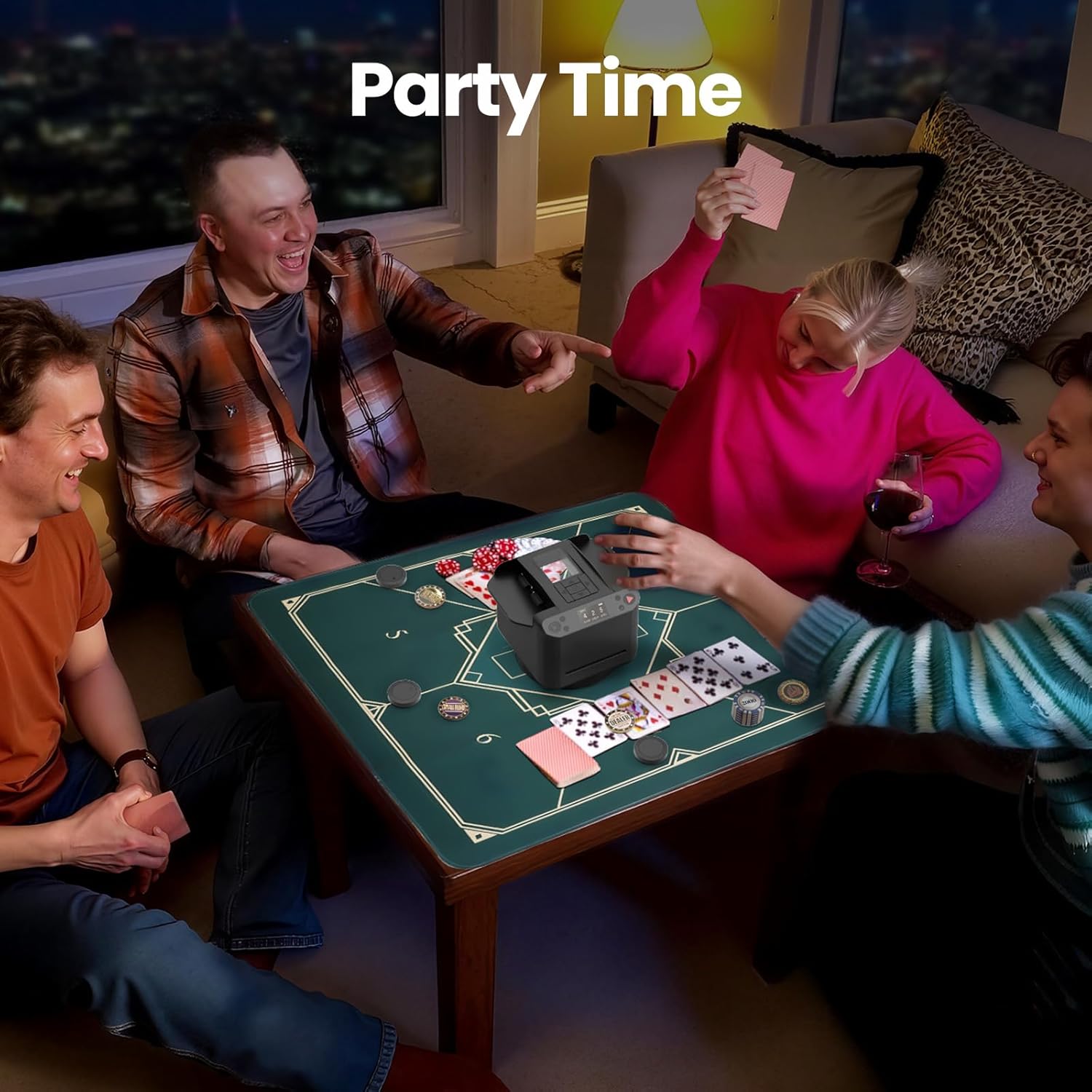 - [Quiet, Portable & Rechargeable] Equipped with a low-noise, anti-vibration motor, a 5200mAh rechargeable battery, and a non-slip base, the card shuffler operates quietly and smoothly. With 3-7 days of battery life on a single charge and 6+ hours of continuous use, it’s perfect for home parties, trips, or camping. Its compact design, anti-slip base, and easy portability make it ideal for entertainment on the go.