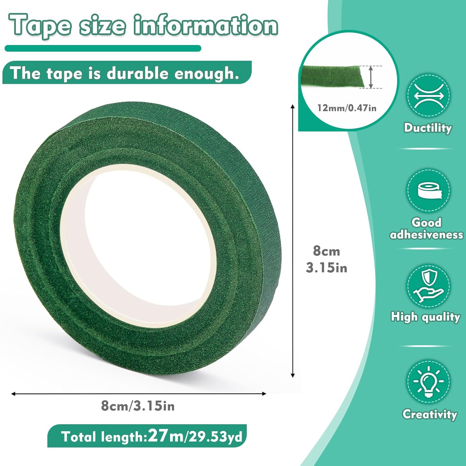 - Floral Tape for Bouquets: Dimensions: each roll is 0.47 inch (1.2)CM in width and 30 yards(27M) in length. Strong and Stretchable, it tears easily, lightweight, and flexible to use