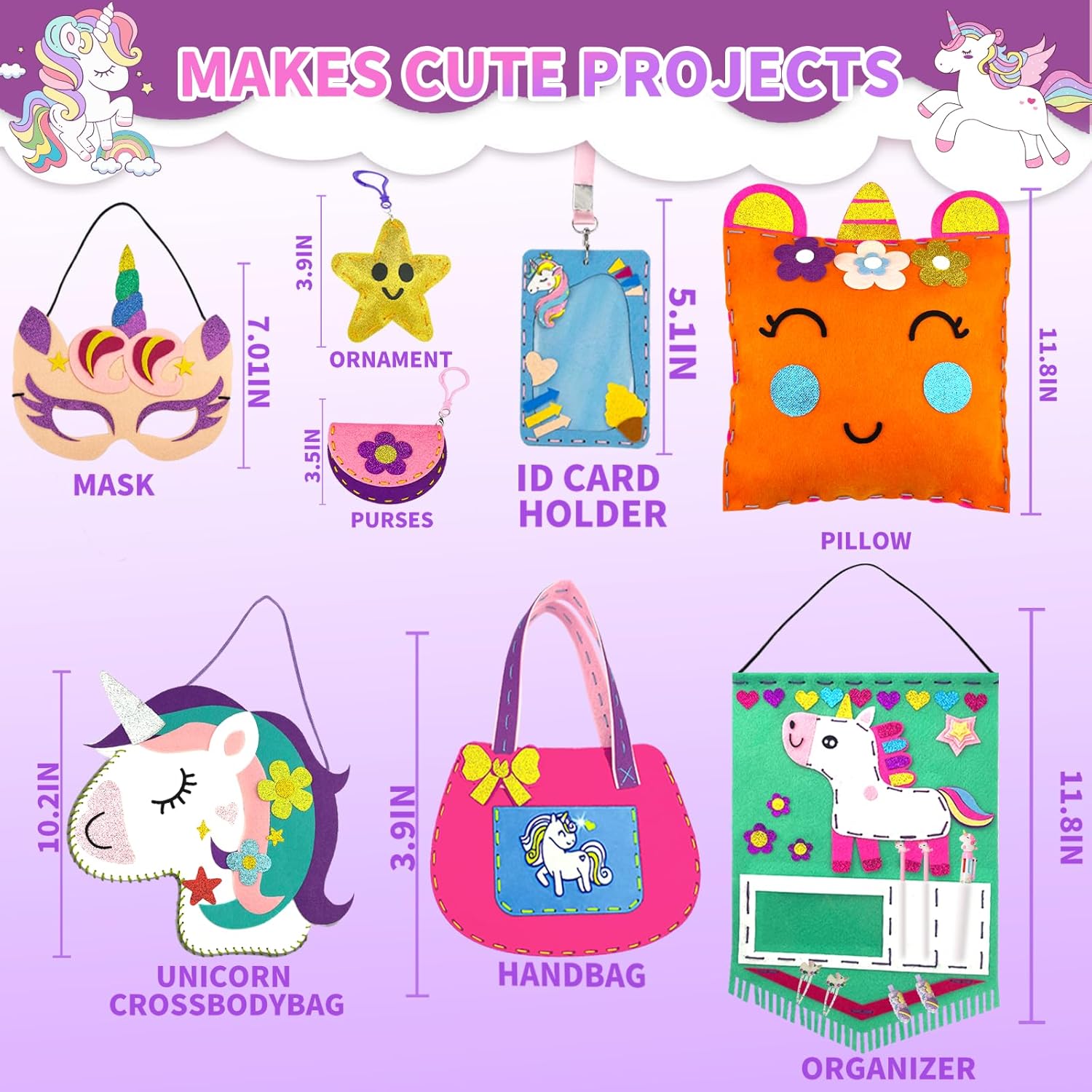 - 【 Make 8 Easy Projects 】Craft and create with our beginner-friendly kids sewing kit! Make 8 fabulous projects including Mask, Ornament, ID Card Holder, Purses, Pillow, Unicorn Crossbody Bag, Handbag & Organizer. Includes easy graphic instructions to help kids learn threading, stitching, and embroidery with confidence.