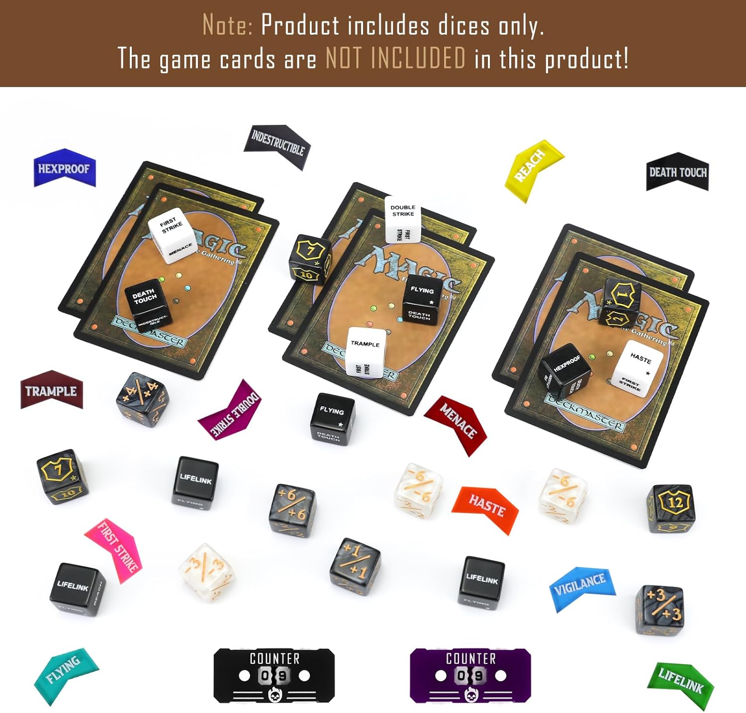 - PACKAGE INCLUDED - Comes with 60pcs MTG keyword tokens & 60pcs MTG dice & 2pcs life counter set. Compatible with MTG/CCG/TCG card gaming and other table games. Enough for your daily game use and replacement, and even for your school, bar, and club games.