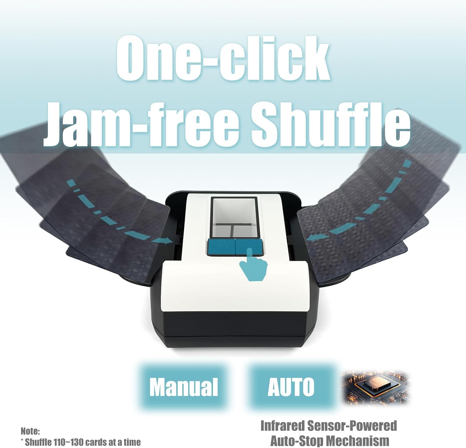 - 【Dual Shuffling Modes - Auto & Manual】Press the AUTO button for hands-free shuffling (smart sensor stops automatically when done) or use Manual mode (press-and-hold) for controlled shuffling, ideal for games requiring precision