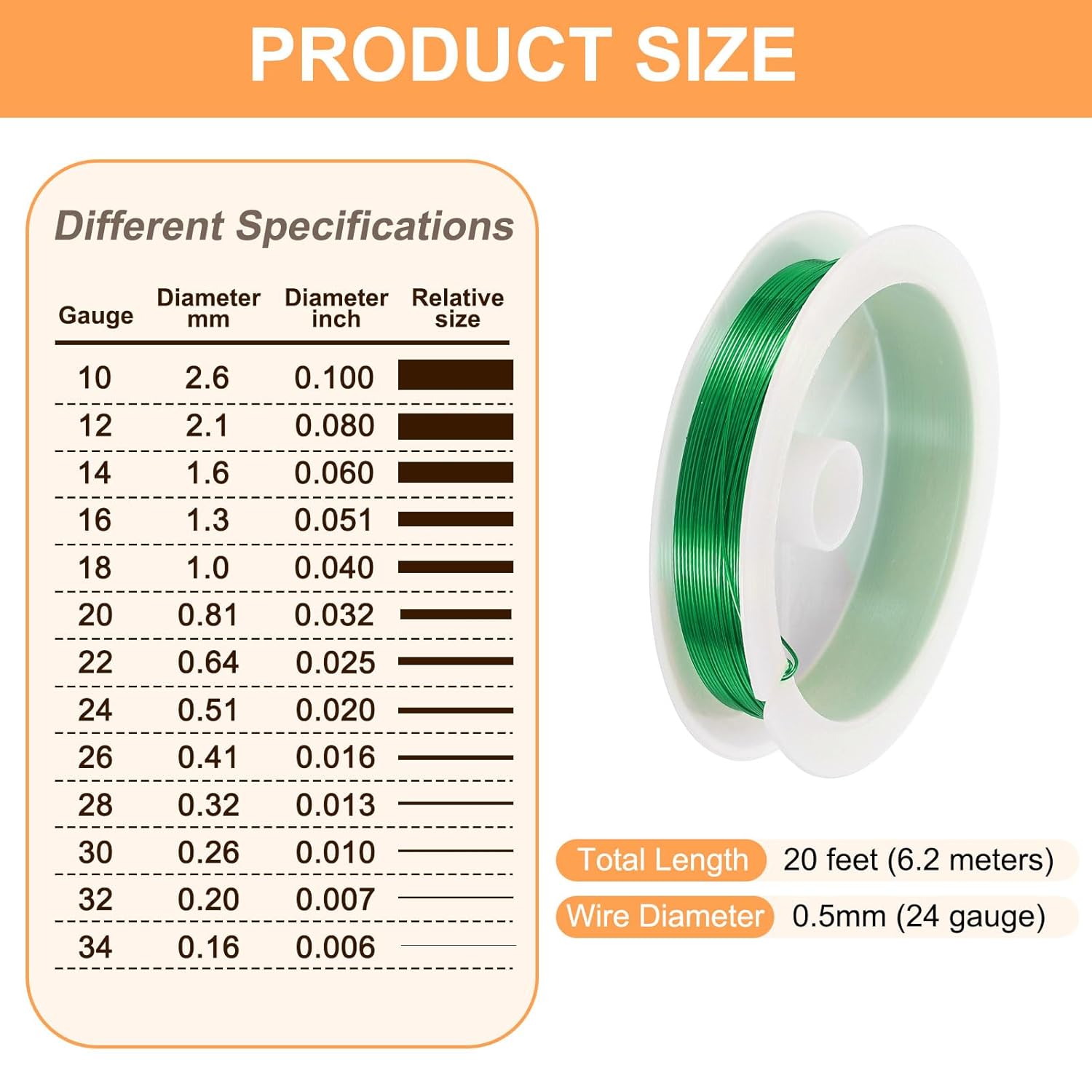 - Size - The diameter of the art wire is about 0.5mm (24 gauge) and 20 feet (6.2 meters) long. The art wire is suitable for jewelry making, beading, and jewelry repair.