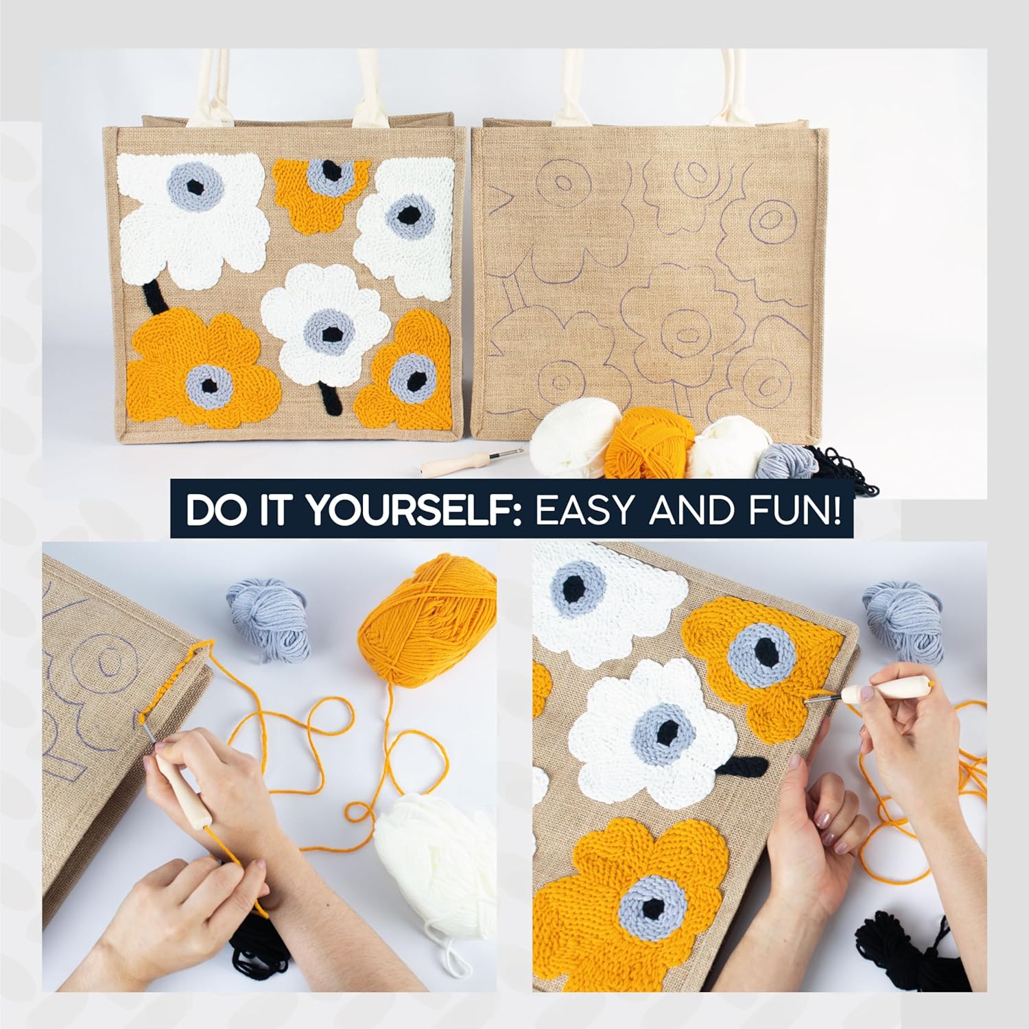 - RELAXING, BEGINNER-FRIENDLY CRAFT EXPERIENCE – This punch needle embroidery kit comes with everything you need to succeed: pre-printed jute tote, premium yarn, ergonomic tools, and easy instructions. Whether you're just starting or rediscovering your creative side, enjoy a calming DIY activity that delivers satisfying results without frustration