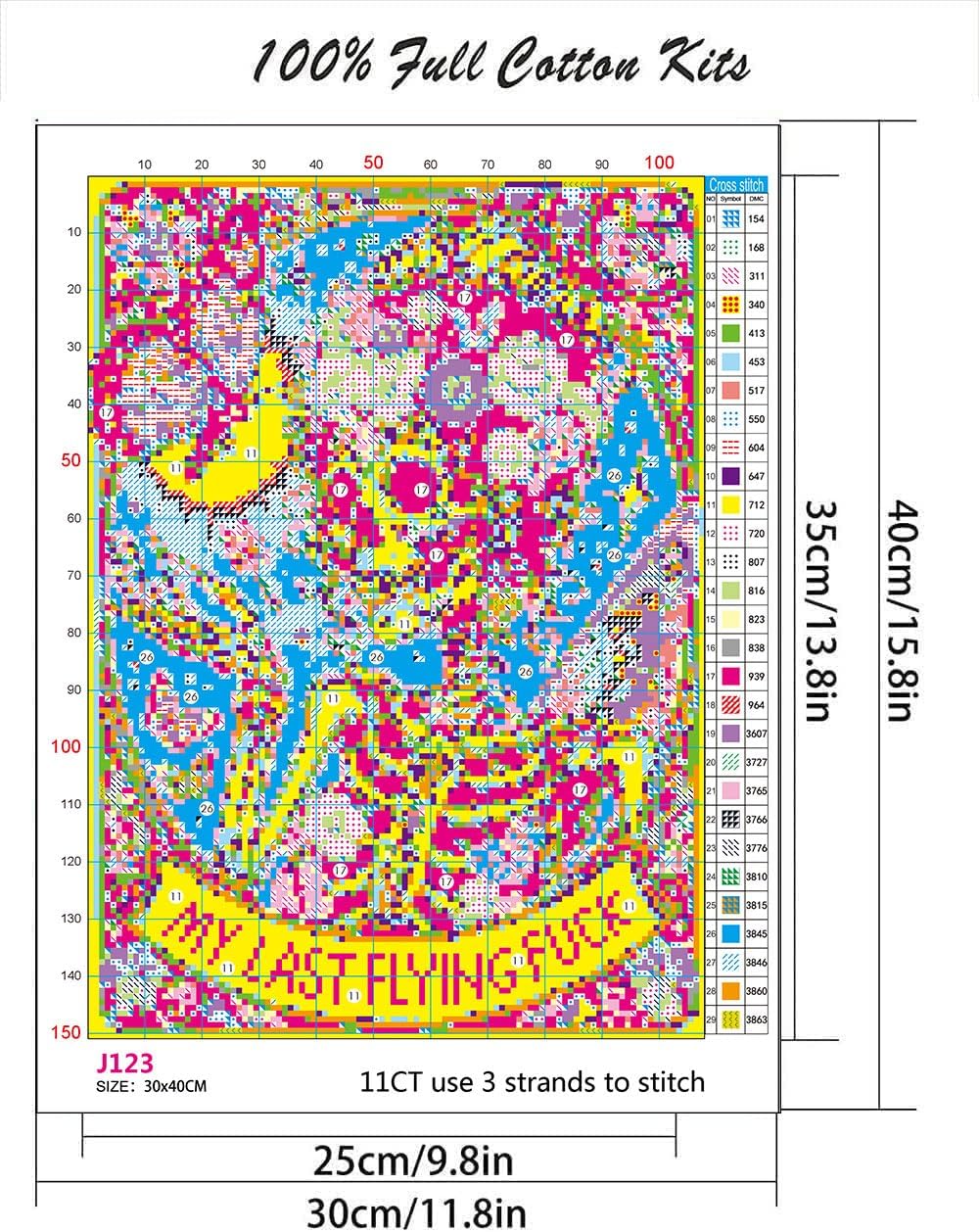 - Pre-printed Pattern Fabric:The Skull cross stitch patterns is clearly printed with small squares which are coloured and marked with symbols. Each symbol corresponds to a cross-stitch thread color. The symbol is written on the chart, and the corresponding thread color is written below the chart.