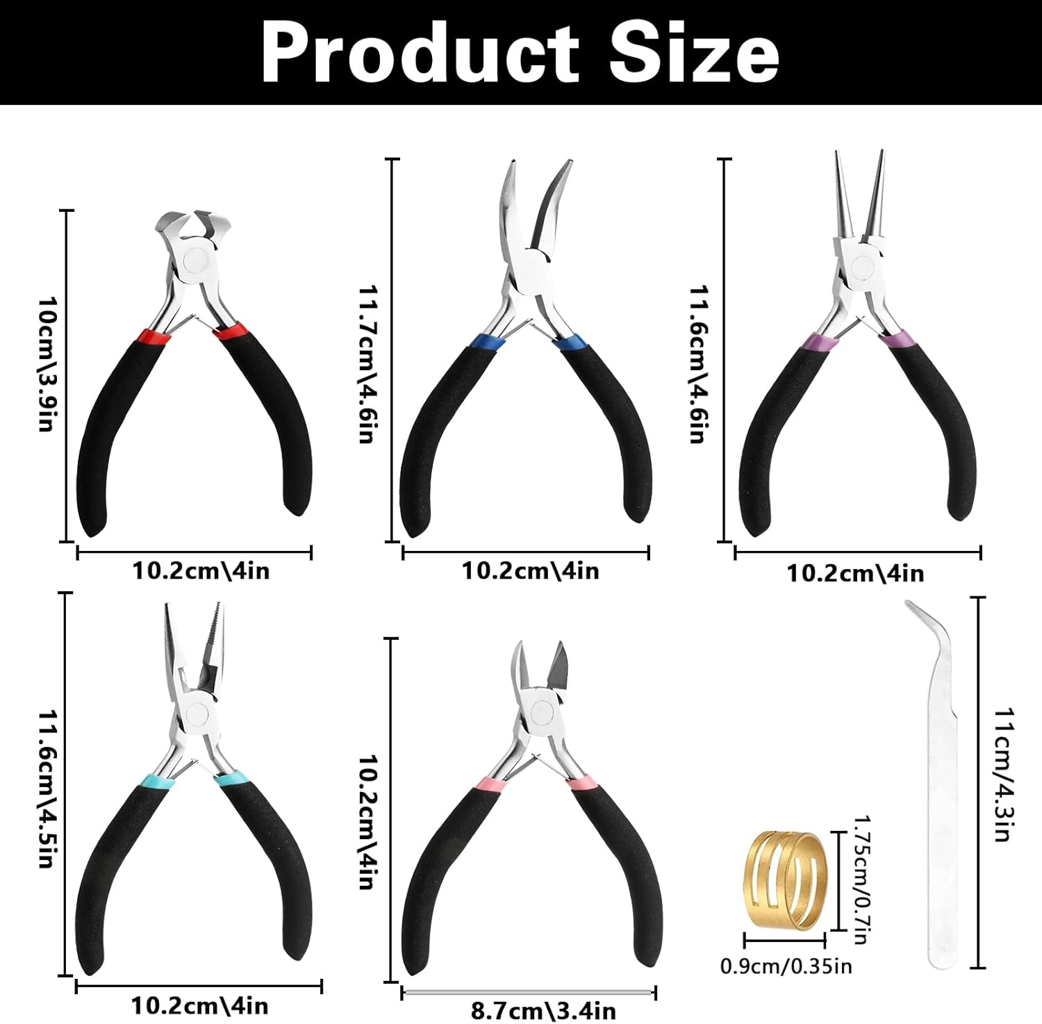 - Premium Material Jewelry Pliers Set: The jewelry pliers are made of high quality steel, durable and sturdy, rust resistant for long-time use. Package including: needle nose pliers, round nose pliers, bend nose pliers, end cutting pliers, wide cutter pliers, tweezer and a jump ring.