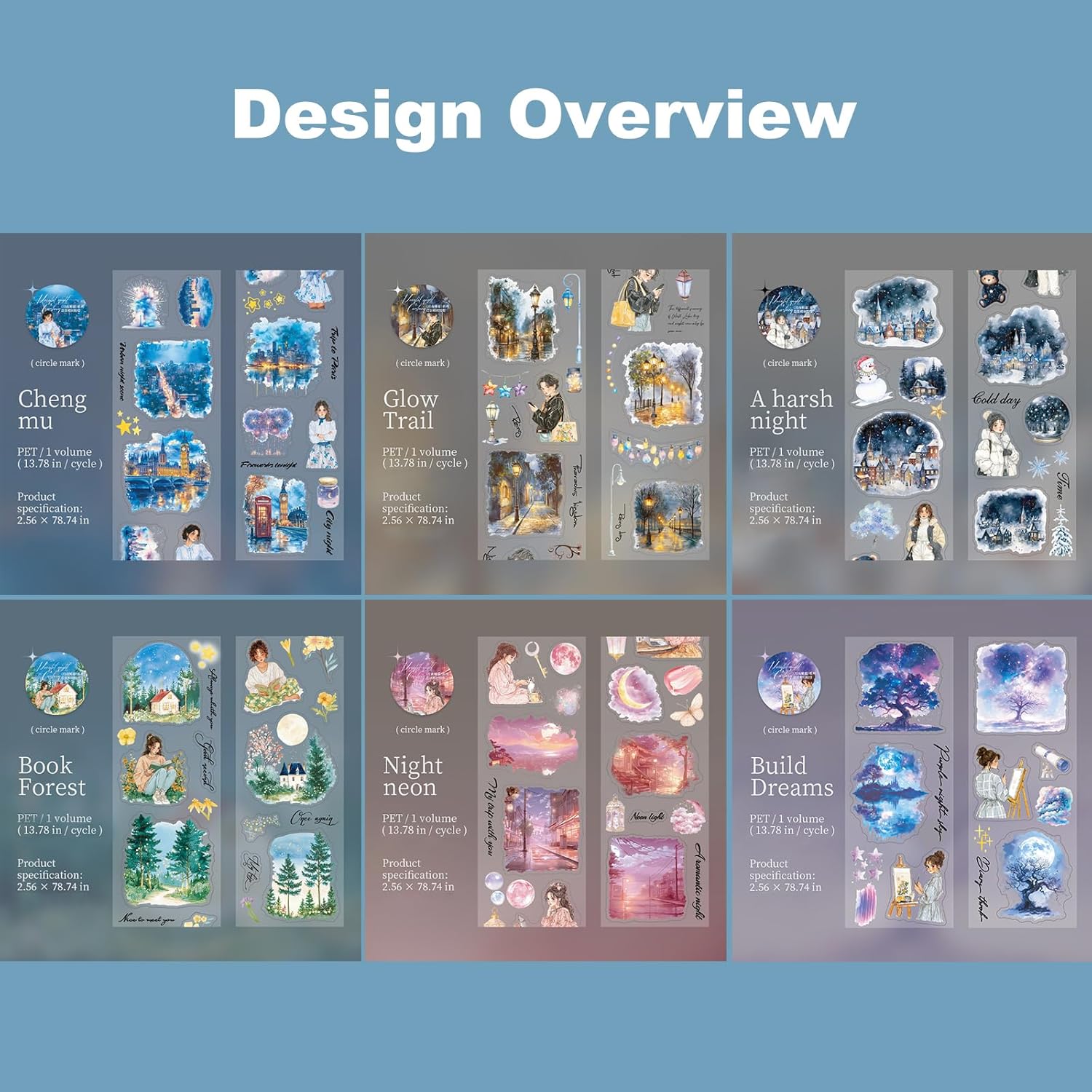 - Whimsical Night Theme Design: Features 6 unique nightscape styles with characters and scenery, each roll includes a variety of pre-cut PET stickers to enrich scrapbook and journal scenes with dreamy atmosphere