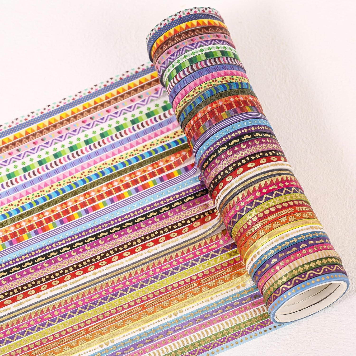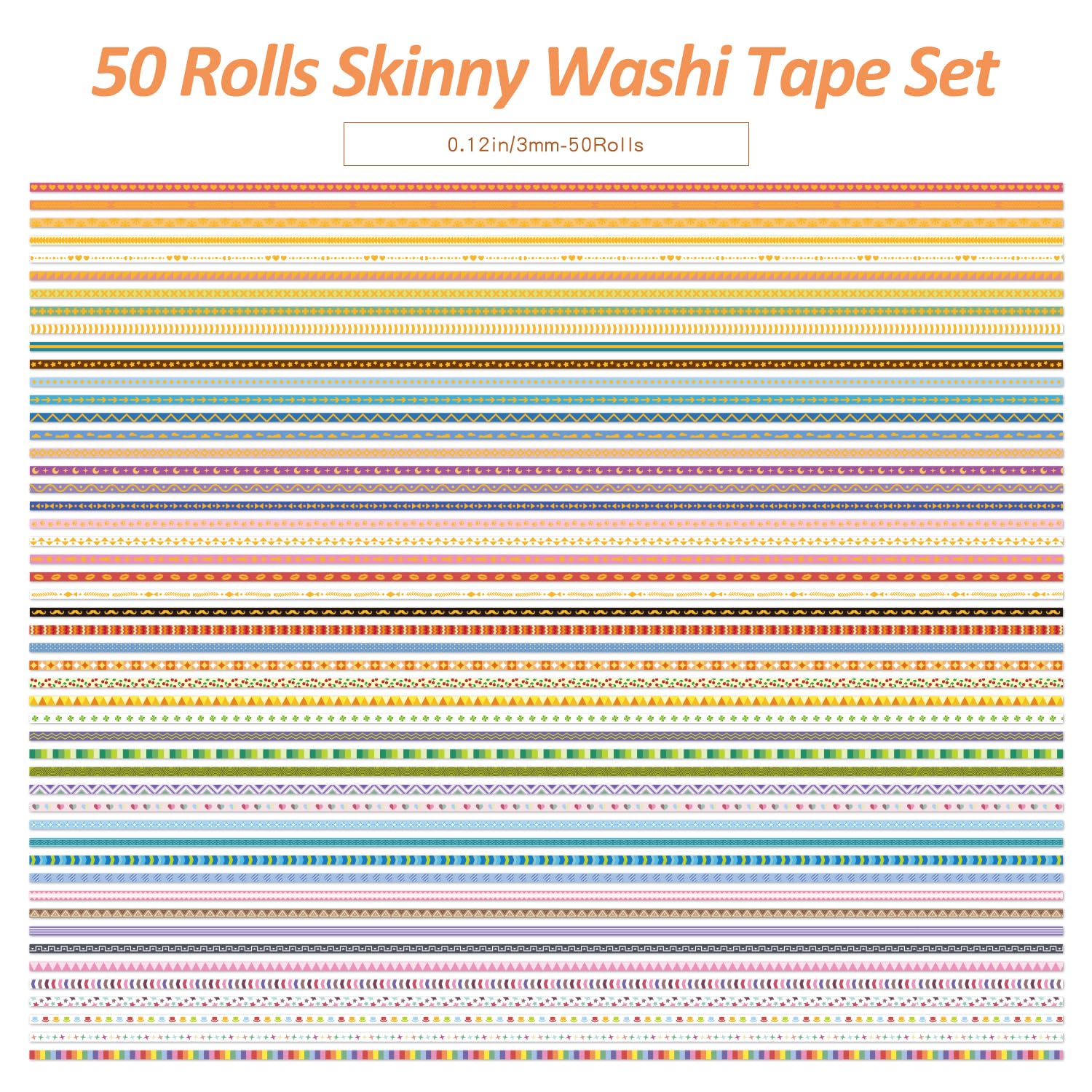 - This thin washi tapes contain 50 rolls of different designs, using a light grayscale rainbow color, with basic patterns such as lines, dots, bows, hearts, triangles, curves, etc.The very thin sizes plus special color schemes and designs for you to be able to use these thin tapes as a decoration for dividing lines, borders, or other details of your work.