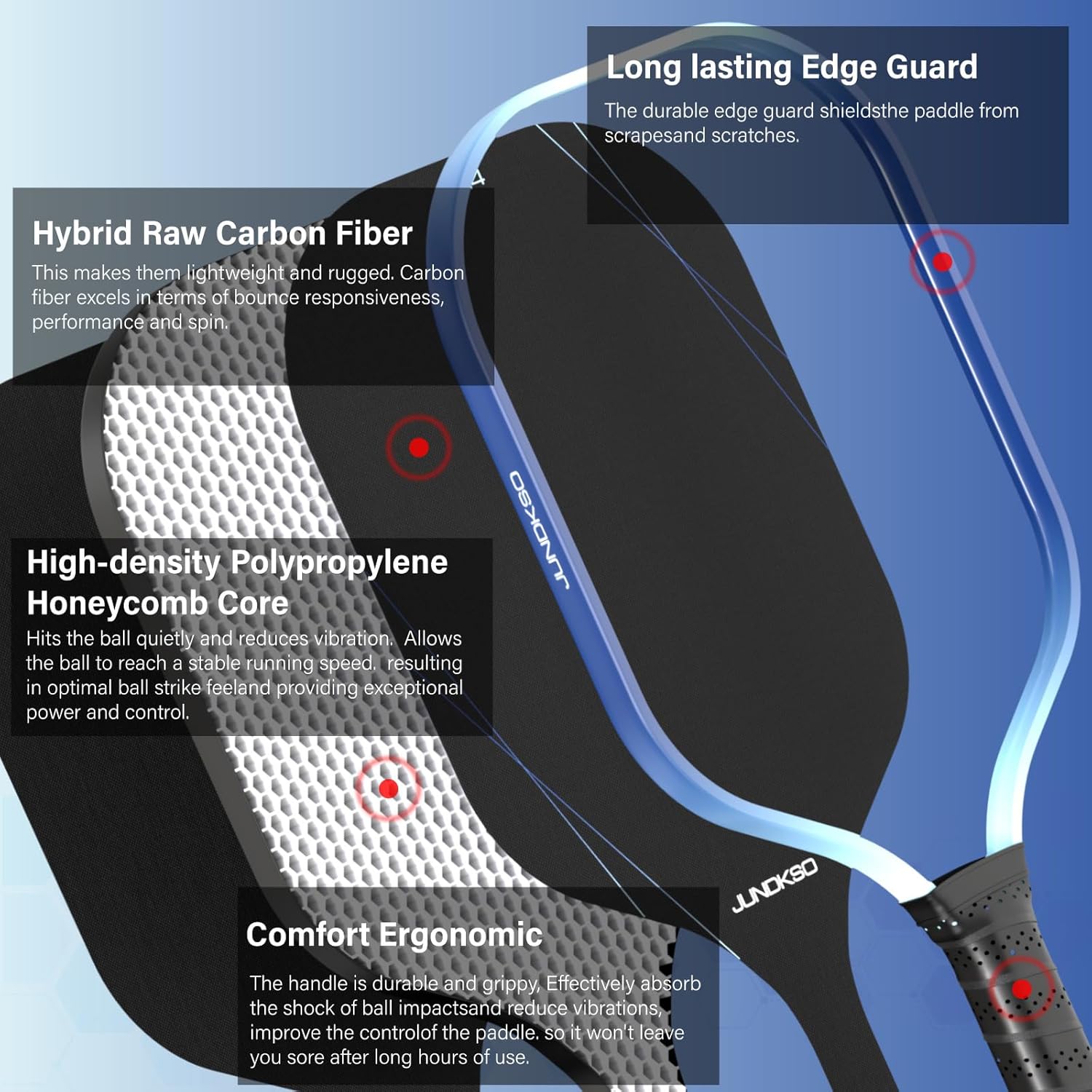 - Polymer honeycomb Core Material in conjunction with advanced manufacturing processes / one-piece molding: Each paddle is manufactured strictly according to USAPA standards. The THC polymer honeycomb core of our JUNDKSO carbon fiber pickleball paddles is created with elastic material, providing an excellent batting feeling with a larger sweet spot and exceptional stability. Bring you an unprecedented gaming experience.