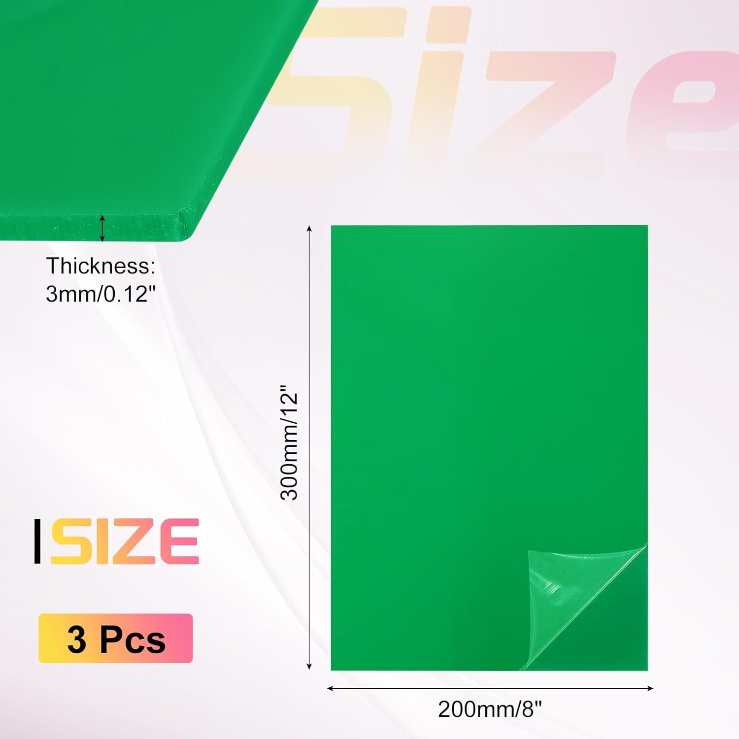 - Color:Green;Size: 300x200mm/12 x 8 Inch (L*W);Thickness:3mm/0.12 inch;Material: Acrylic;In the package of: 3Pcs x colour plastic sheets.